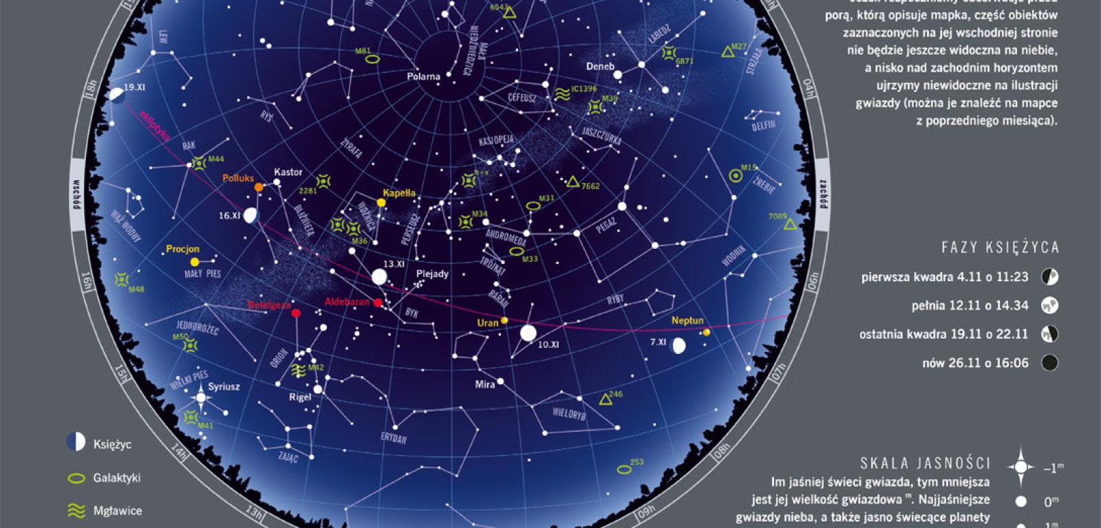 Pomimo zdarzających się w tym czasie słot z nadzieją patrzymy w niebo. Zwłaszcza na nocne, które ukazuje nam już powoli najpiękniejsze zimowe gwiazdozbiory. Noc trwa w listopadzie długo: na początku miesiąca od 16:08 do 6:31, a pod koniec aż od 15:28 do 7:21. Przy długich nocach dni również nie są zbyt jasne – Słońce obniża swoją maksymalną wysokość z 23,4° do 16,1°. Na naszą dzienną gwiazdę szczególnie warto zwrócić uwagę 11 listopada, gdy przez jej tarczę będzie się przesuwała mała czarna kropka – planeta Merkury. A w nocy? Listopad jak co roku zapowiada rój Leonidów – odłamków pyłu pozostawionego na torze komety 55P/Tempel-Tuttle. Maksimum roju spodziewamy się w nocy z 18 na 19 listopada. Niestety, będzie on wybiegał z okolicy gwiazdozbioru Lwa, w którego pobliżu będzie jasno świecił Księżyc przed ostatnią kwadrą. Na pewno nie zawiodą nas jednak gwiazdozbiory. W listopadowy wieczór na południowo-zachodnim niebie wciąż królują Pegaz z Andromedą, a w ich pobliżu unosi się przyszły mąż etiopskiej królewny, Perseusz. Na wschodzie pojawiają się już zapowiedzi zimowego nieba: gwiazdozbiory Bliźniąt i Oriona.