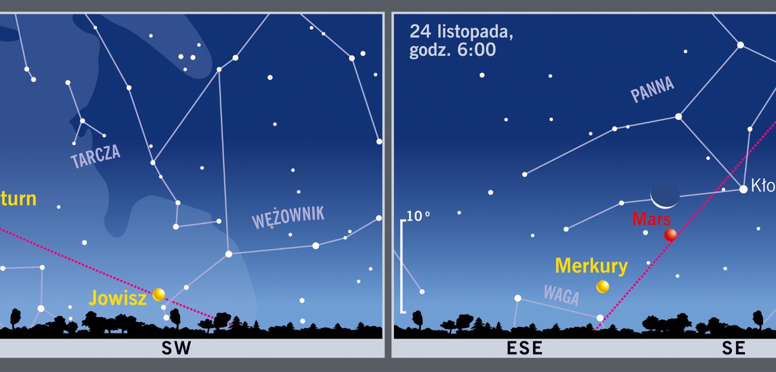 Już 2 listopada wieczorem zobaczymy Księżyc obok Saturna w Strzelcu. 24 listopada nad ranem nasz satelita odwiedzi gwiazdozbiór Panny i widocznego na jego tle Marsa.