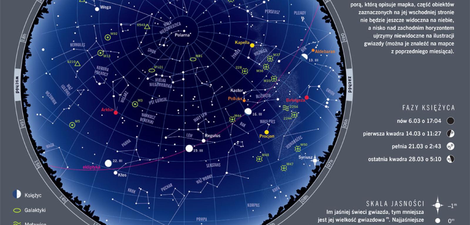 Nareszcie wiosna. Dzień, w którym Słońce przetnie równik niebieski, to w tym roku 20 marca, a nastąpi to o 22:58. Dni stają się już dłuższe od nocy – na początku miesiąca Słońce wschodzi o 6:23, a zachodzi o 17:15. Z końcem miesiąca dzień trwa o dwie godziny dłużej, bo od 6:14 do 19:08. Maksymalny kąt, pod jakim promienie słoneczne padają na ziemię, rośnie w marcu z 30,2° do 41,9°. Jedynym ciemniejszym punktem wśród tych dobrych dla nas wieści jest wiosenna zmiana czasu – 31 marca pośpimy krócej, bo wskazówki zegarów przesuwamy z 2 na 3 w nocy. Marzec otwiera nam możliwości obserwacji pierwszych wiosennych gwiazdozbiorów: choć wieczorami zobaczymy jeszcze zachodzącego Oriona, na wschodzie możemy się już witać z Lwem i niosącą jasny Kłos Panną. To z niej zdają się też wybiegać aktywne przez większą część miesiąca Wirginidy, których maksimum pojawia się zwykle w okolicy 24 marca (niestety w tym roku niedługo po księżycowej pełni).