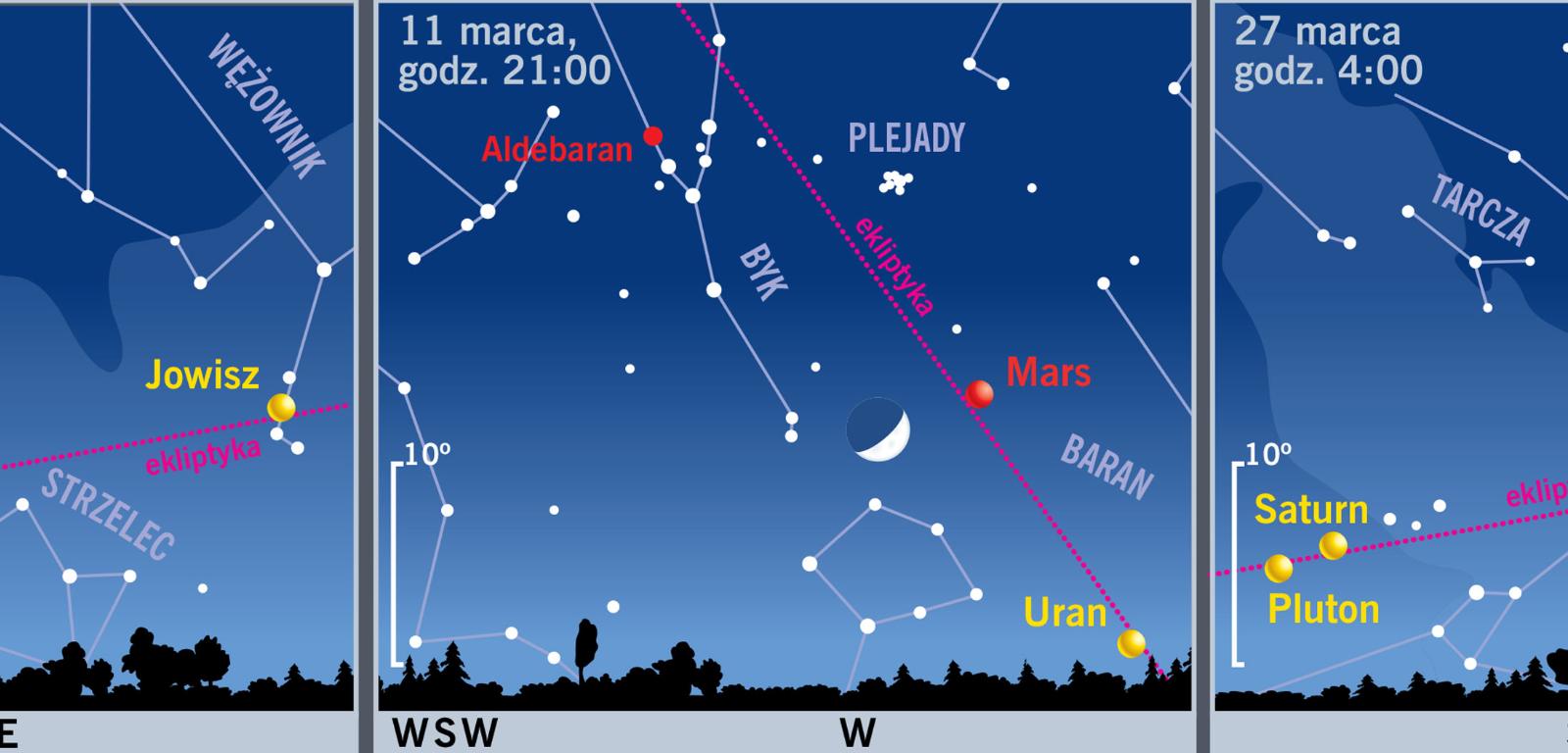 Już 1 marca nad ranem Księżyc zbliży się do Saturna w Strzelcu. 11 marca Srebrny Glob odwiedzi Marsa w Baranie. 27 marca nasz satelita będzie widoczny w okolicy Jowisza w Wężowniku.