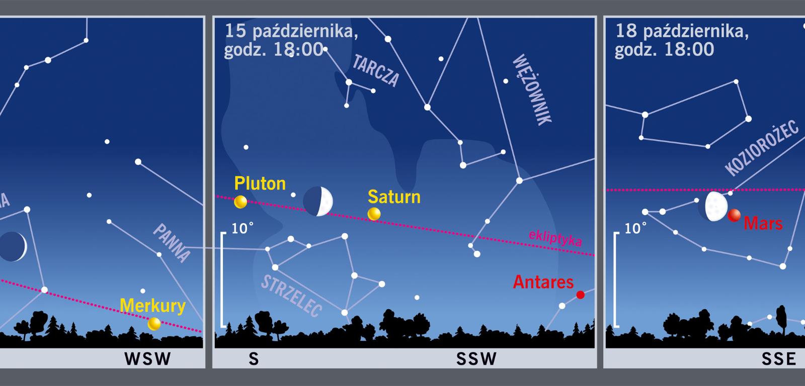 11 października wkrótce po zachodzie Słońca zobaczymy wąziutki sierp Księżyca w Wadze w pobliżu Jowisza. 15 października Srebrny Glob przesunie się w stronę Saturna, z którym spotka się w Strzelcu. 18 października nasz satelita odwiedzi Marsa w Koziorożcu.