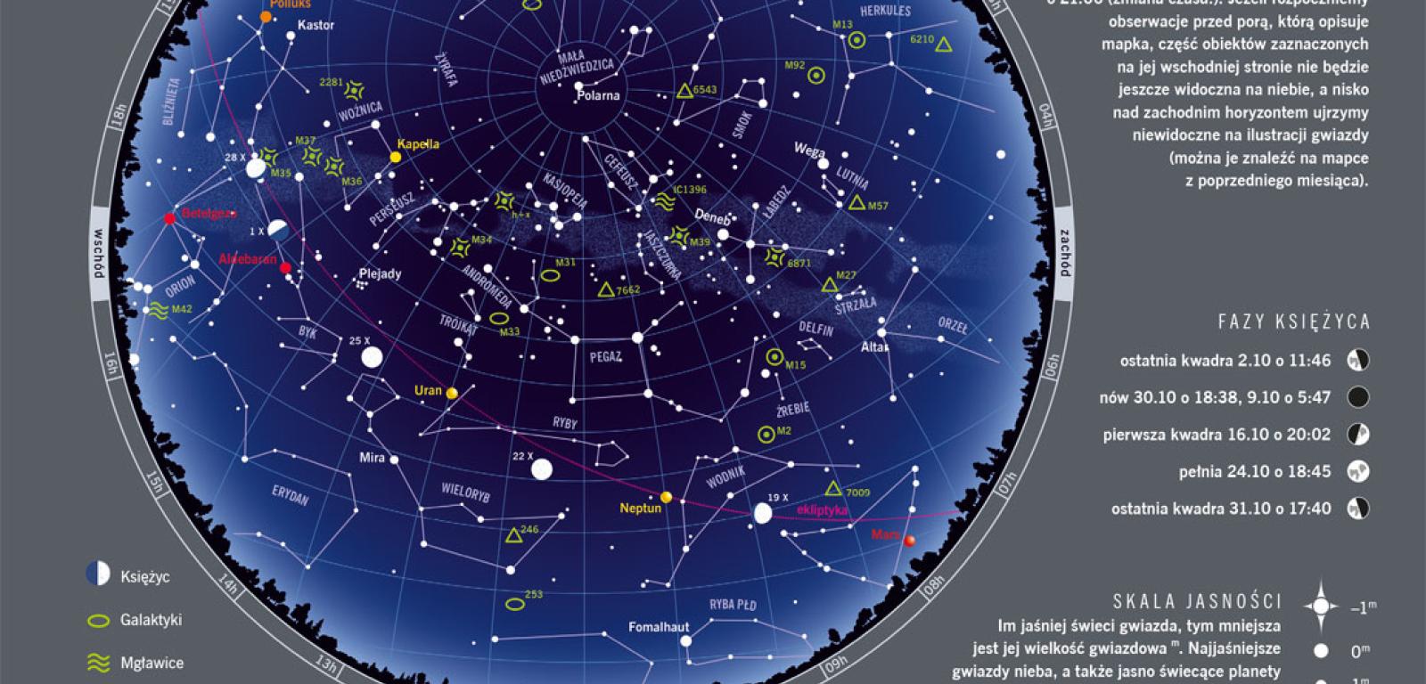 Październik pozwala nam się wyspać. Noc z soboty na niedzielę 28 października potrwa bowiem dłużej – przestawiamy zegary z godziny 3:00 na 2:00. Dzień nie tylko się więc skraca, ale i poniekąd przesuwa: na początku miesiąca trwa od 6:37 do 18:14. Pod koniec miesiąca wschód i zachód Słońca zmieniają się na 6:30 i 16:09. Maksymalna wysokość Słońca nad horyzontem maleje w październiku z 34,5° do 23,6°. Zmiana czasu umożliwi nam wcześniejsze podziwianie wieczornego nieba. Już ok. 18:00 zobaczymy wschodzącego Byka z czerwonym okiem Aldebarana, zachodzącego Wolarza z pomarańczowym Arkturem, a także unoszącą się nisko na niebie Rybę Południową, a w niej jedną z najjaśniejszych gwiazd po tej stronie nieboskłonu – Fomalhaut. W zenicie wciąż widzimy Deneba wraz z konstelacją Łabędzia. Z mniej stałych zjawisk w październiku warto zapolować na meteory. Na początku miesiąca z konstelacji Woźnicy będą wybiegały delta Aurygidy, później na niebie napotkamy Drakonidy i Orionidy – maksimum aktywności tego pochodzącego z komety Halleya roju możemy się spodziewać ok. 21 października. W końcu miesiąca możemy też spoglądać w pobliże widocznej od wczesnego ranka konstelacji Lwa, by natknąć się na mirydy Leo.