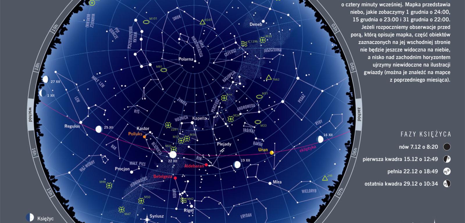 Nadchodzi najciemniejszy miesiąc w roku, okres początku zimy. W tym roku przyjdzie ona do nas 21 grudnia tuż przed północą – o 23:22. Dni są teraz rekordowo krótkie: na początku grudnia trwają od 7:23 do 15:27, a w sylwestra zaledwie od 7:46 do 15:33. Maksymalna wysokość Słońca nad horyzontem sięga od 15,9° na początku miesiąca do zaledwie 14,7° w ostatnim dniu roku. Jeden z grudniowych dni skłania do obserwacji nieba nawet osoby na ogół nim niezainteresowane. Wypatrujący pierwszej gwiazdki będą mieli w tym roku nieco ułatwione zadanie, jeśli zadowolą się w tej roli Marsem. Planetę zobaczymy na południowym niebie już wkrótce po zachodzie Słońca. A jeśli chcemy się nastawić na prawdziwe, słabiej świecące gwiazdy, gdzie i czego najlepiej wypatrywać? Dużo zależy od tego, na którą stronę świata mamy najlepszy widok. Wysoko nad zachodnim horyzontem odnajdziemy bardzo jasną Wegę. Na północy świeci alfa Woźnicy, Kapella. Na wschodnim niebie wkrótce po zachodzie Słońca zobaczymy czerwone oko Byka, Aldebarana, a później dołączą do niego jasne gwiazdy Oriona i – około godziny 20:00 – najjaśniejsza gwiazda nieba, Syriusz.