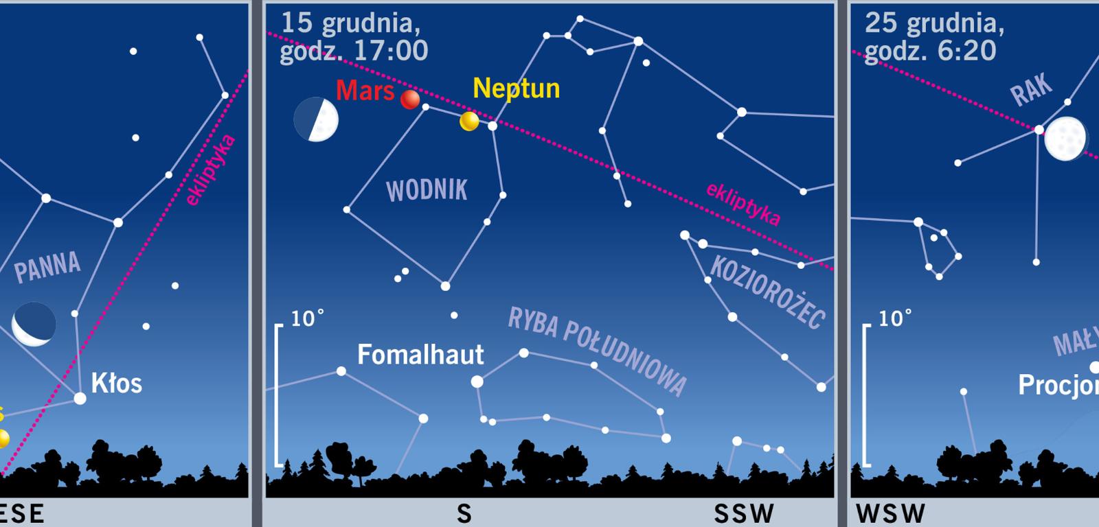 Już 3 grudnia zobaczymy cieniutki sierp Księżyca koło Wenus w Pannie. 15 grudnia nad ranem nasz satelita w pierwszej kwadrze odwiedzi znajdującego się w Wodniku Marsa. 25 grudnia Srebrny Glob, bardzo stosownie do daty, przejdzie tuż obok Żłobka – otwartej gromady gwiazd w Raku.