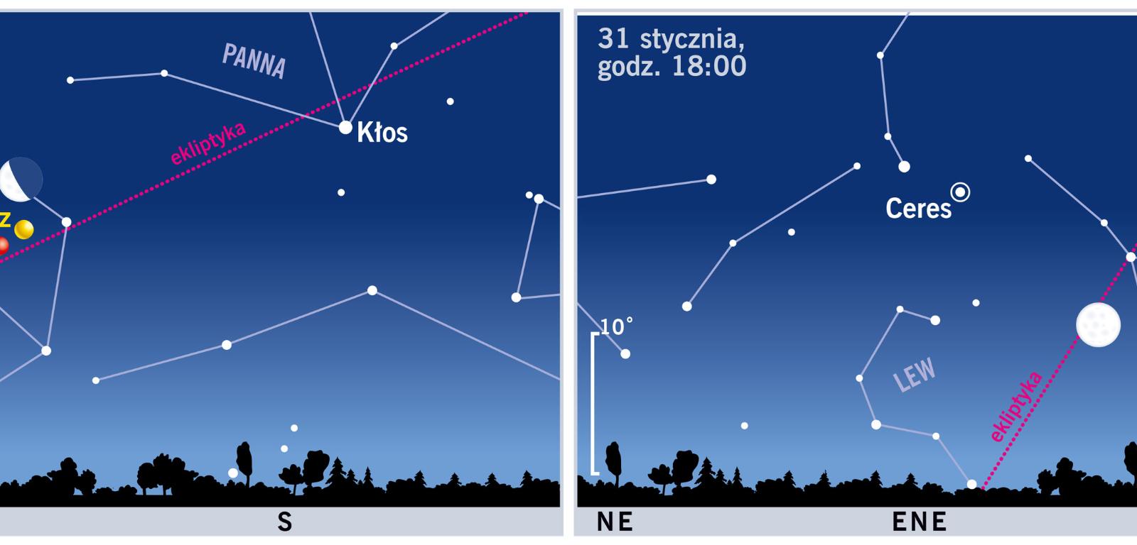 Nad ranem 11 stycznia zobaczymy Księżyc w pobliżu Marsa i Jowisza w Wadze. 31 stycznia Ceres znajdzie się w opozycji do Słońca, ale jednocześnie w położeniu najbliższym Ziemi, od której dzielić ją będzie zaledwie 1,6 j.a. Nieopodal Ceres odnajdziemy też Srebrny Glob.