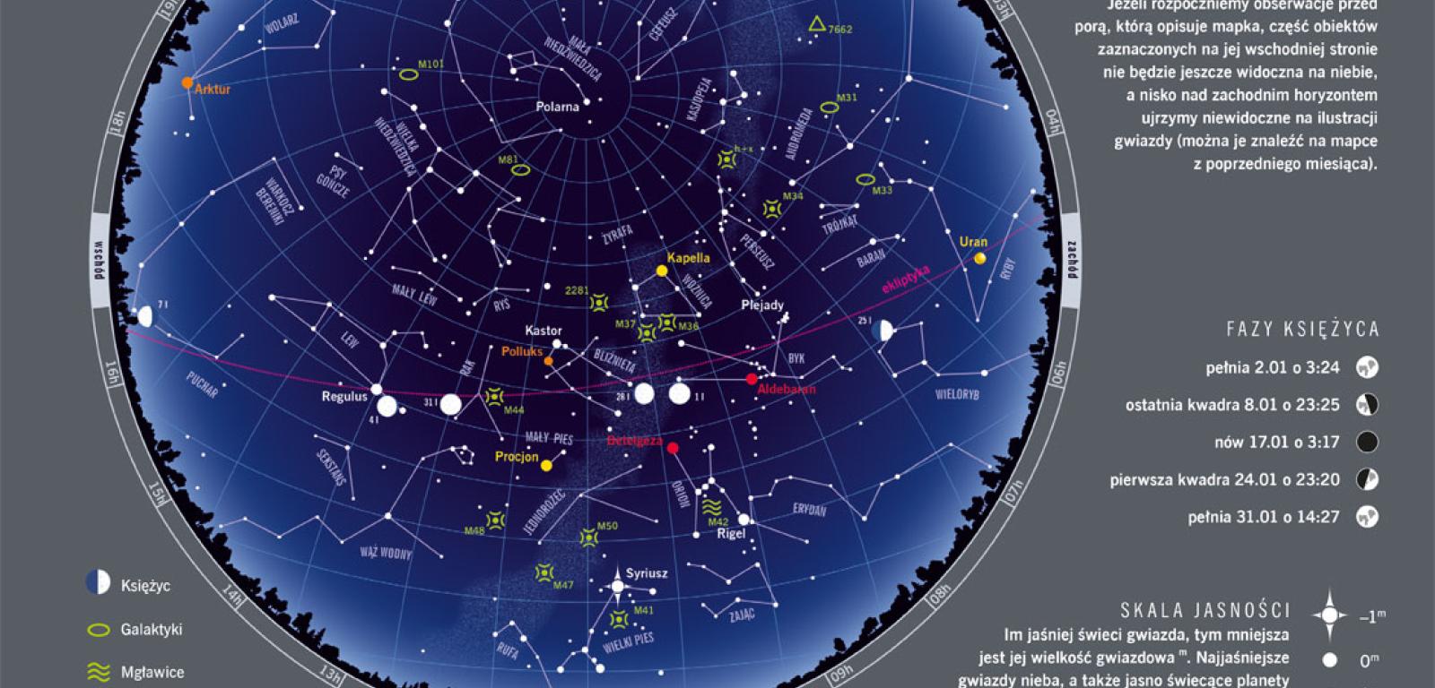 3 stycznia Ziemia jest najbliżej Słońca. Dzieli ją wówczas od niego zaledwie 147,1 mln km, czyli o jakieś 5 mln km mniej niż w lipcu. Mimo to przeżywamy w Polsce najchłodniejszy okres roku. Wynika on z krótkich dni i niskiego toru Słońca nad zimowym horyzontem. Na początku miesiąca wschodzi ono o 7:46, by zajść o 15:34. Pod koniec stycznia obie te pory przesuwają się na 7:19 i 16:21. Maksymalna wysokość Słońca nad horyzontem rośnie wraz z wydłużającym się dniem z 14,8° do 20,4°. Początek nowego roku możemy uczcić, wychodząc na obserwacje Kwadrantydów. Ten stosunkowo aktywny rój ma maksimum 3 stycznia. Przedłużenia torów spadających gwiazd zdają się spotykać na pograniczu Wolarza, Herkulesa i Smoka. W tę i inne noce możemy też podziwiać zimowe gwiazdozbiory Małego i Wielkiego Psa, Byka i Oriona. Niestety ominie nas całkowite zaćmienie Księżyca, które obserwatorzy z drugiej półkuli Ziemi będą mogli podziwiać 31 stycznia.