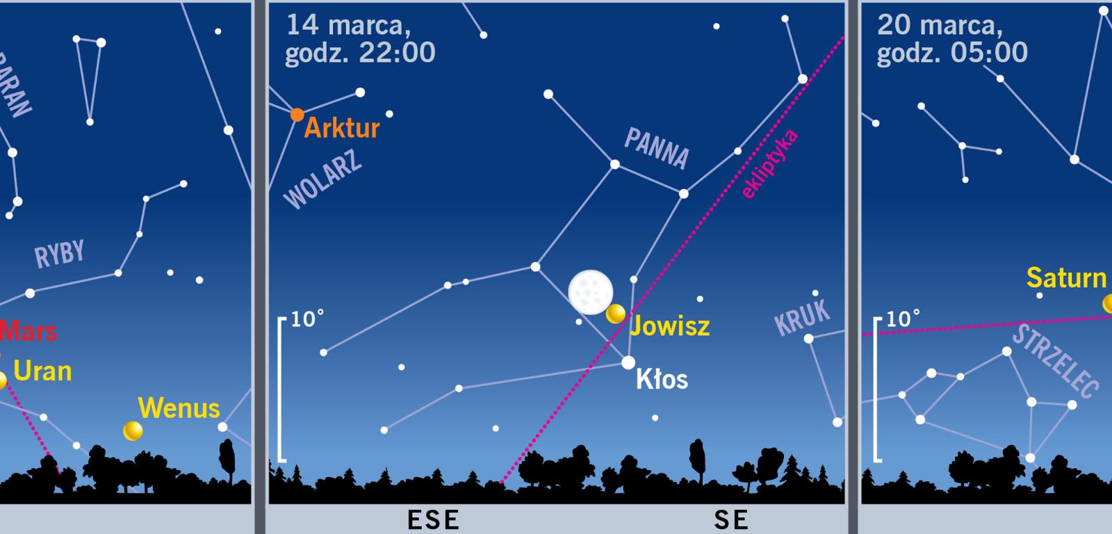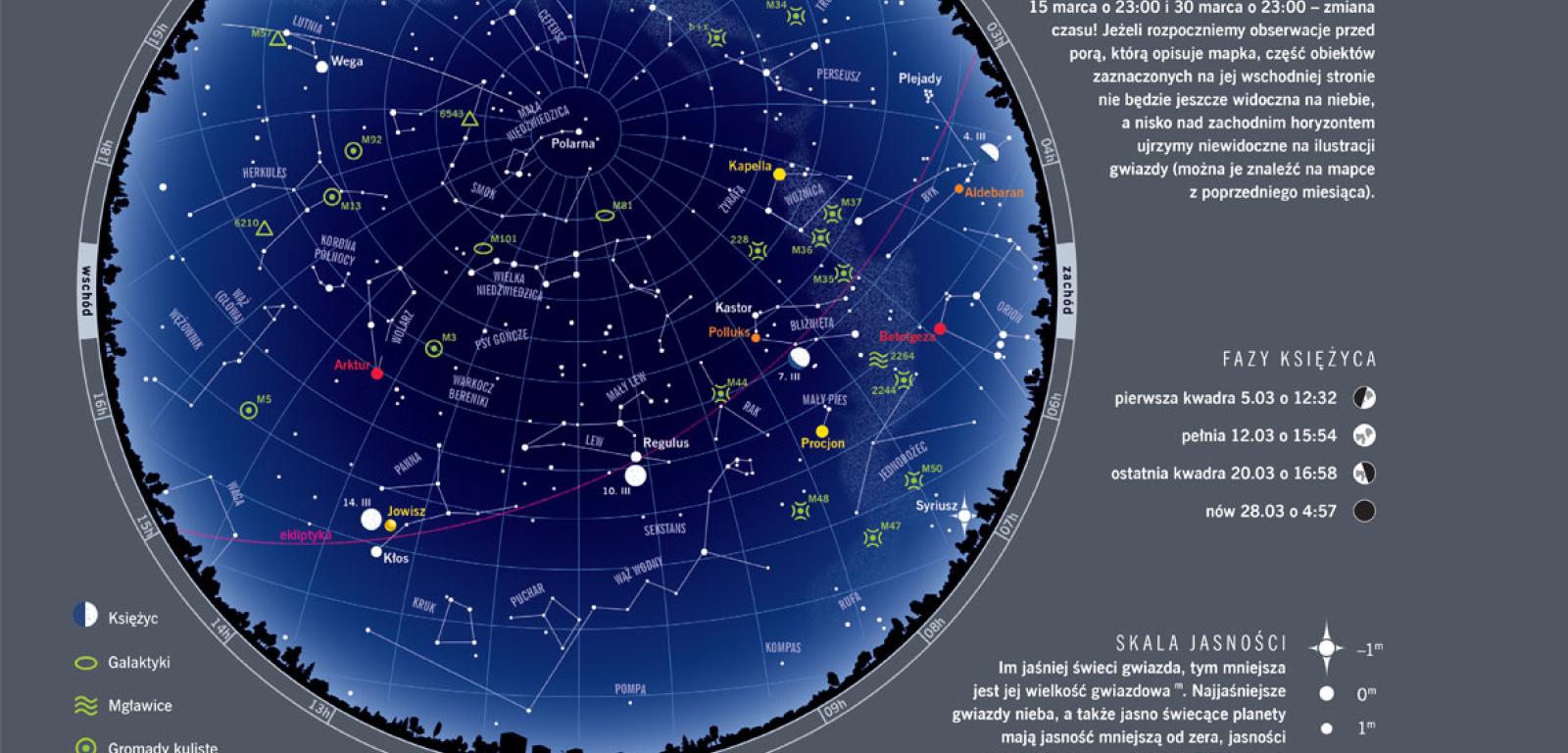 Nadchodzi najbardziej oczekiwana pora roku. Słońce przetnie równik niebieski, rozpoczynając wiosnę, 20 marca o 11:28. Zaczyna się okres dni dłuższych od nocy. Gdy na początku miesiąca wschód następuje o 6:22, a zachód o 17:16, ostatniego dnia marca możemy się cieszyć dniem o dwie godziny dłuższym, bo trwającym od 6:13 do 19:09. Jest coraz cieplej, bo Słońce grzeje naszą półkulę nie tylko coraz dłużej, ale i coraz efektywniej: maksymalny kąt padania promieni słonecznych na ziemię rośnie w marcu z 30,3° do 42,1°.