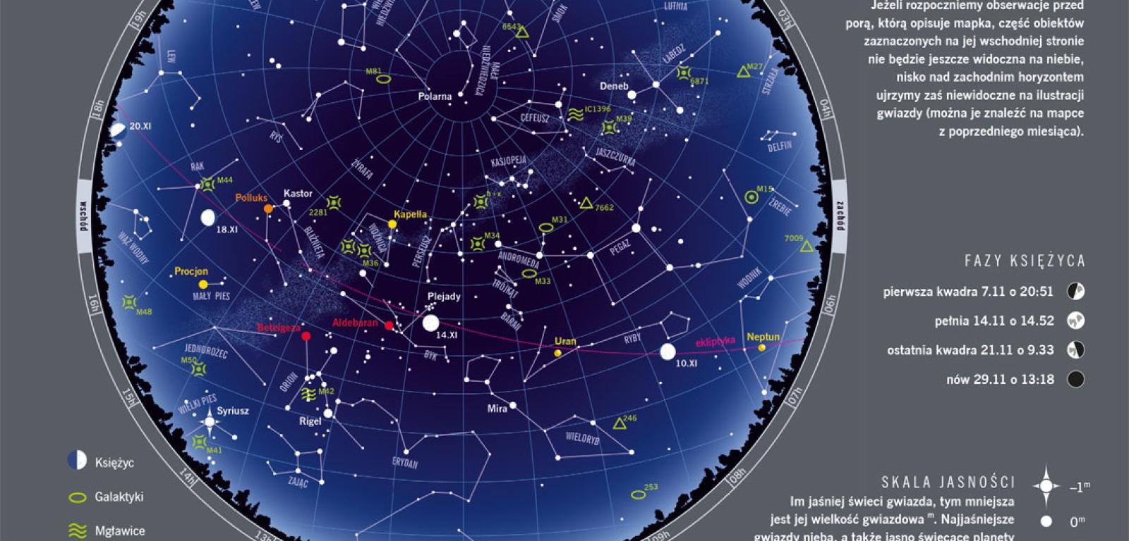 Pomimo złej opinii listopad może być jednym z najładniejszych miesięcy: zimnym, ale słonecznym dniom towarzyszą czasem pogodne noce. Na początku listopada dzień trwa od 6:32 do 16:06, a pod koniec miesiąca zaledwie od 7:22 do 15:28. Maksymalna wysokość Słońca nad horyzontem maleje w listopadzie z 23,1° do zaledwie 16°. Nocne niebo widzimy więc długo – i jest na nim czego wypatrywać. Listopad to miesiąc Leonidów, meteorów wybiegających z konstelacji Lwa. Te drobne odłamki kosmicznej materii, wpadające w ziemską atmosferę z rekordową prędkością ponad 70 km/s, to fragmenty komety 55P/Tempel-Tuttle, która powraca w pobliże Słońca raz na 33 lata.
