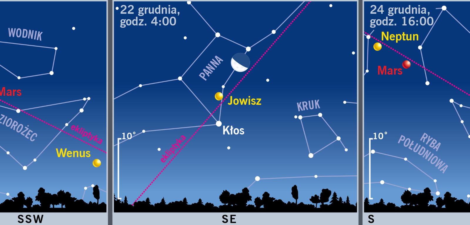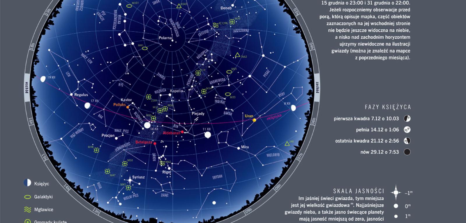 Choć mróz pojawił się już wcześniej, astronomiczna zima przychodzi dopiero 21 grudnia o 11:44. Jesteśmy w okresie najkrótszych dni: na początku miesiąca trwają one od 7:23 do 15:27, 31 dnia miesiąca – zaledwie od 7:46 do 15:33. Maksymalna wysokość Słońca nad horyzontem sięga od 15,9° na początku miesiąca do zaledwie 14,3° na samym początku zimy. Tradycyjnym astronomicznym tematem grudniowym są poszukiwania pierwszej gwiazdki. W tym roku zapaleni poszukiwacze nie powinni mieć problemu.