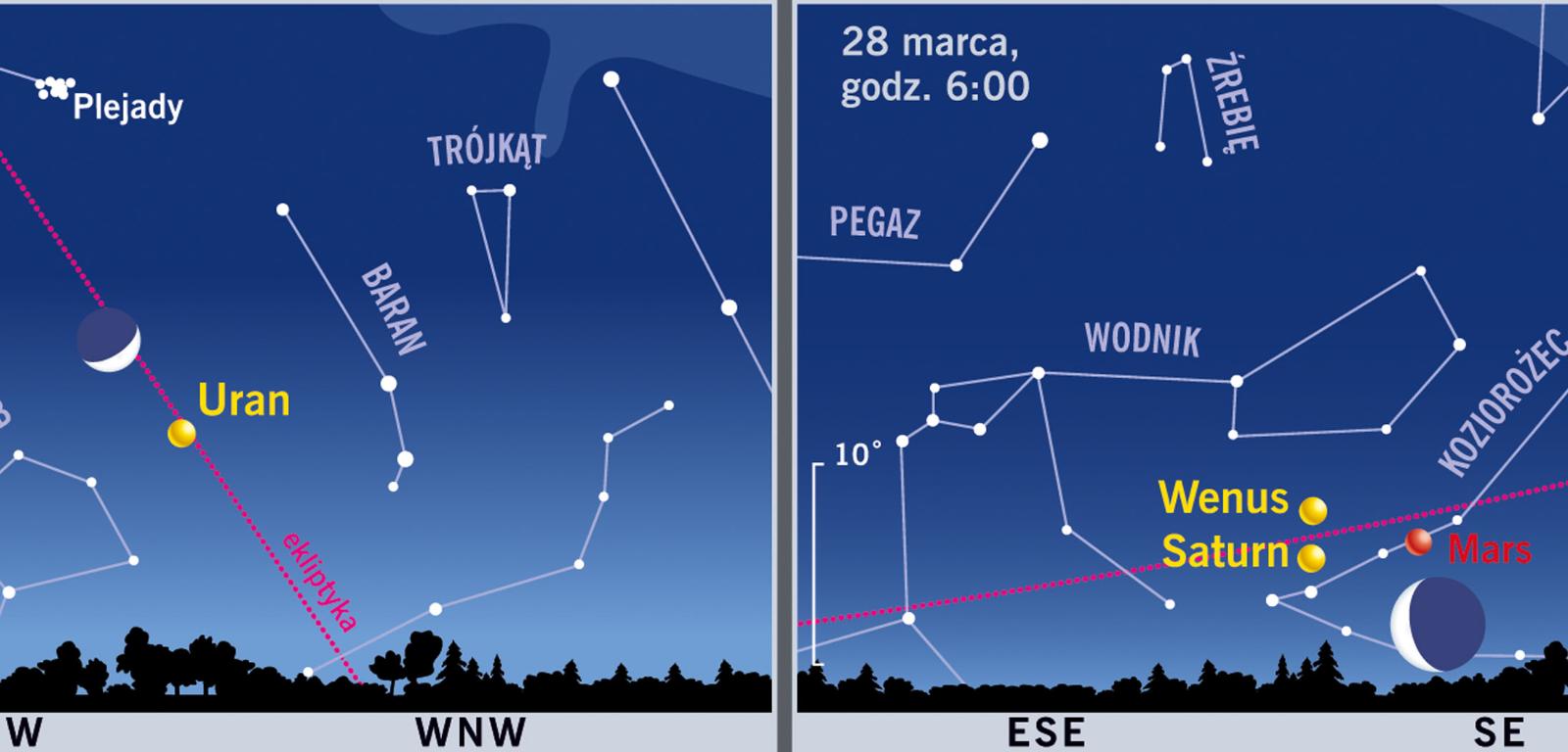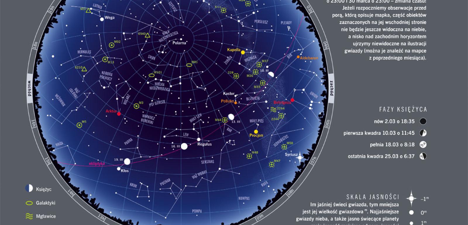 Nadchodzi czas równonocy. Słońce minie punkt Barana i oficjalnie rozpocznie wiosnę 20 marca o 16:33. Od tej daty noc będzie już krótsza od dnia, choć na początku nieznacznie. W pierwszych dniach marca Słońce wschodzi o 6:23 i zachodzi o 17:15. Pod koniec miesiąca dzień trwa już od 6:14 do 19:08. Jak widać, dzień się wydłuża, ale rozciągają się raczej godziny wieczorne. Efekt ten wynika z marcowej zmiany czasu. W niedzielę 27. dnia miesiąca wskazówki zegarów powinniśmy przesunąć z 2:00 na 3:00 w nocy.