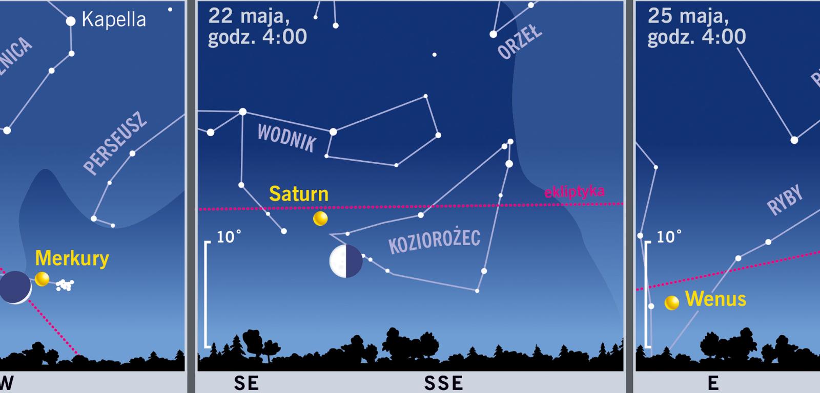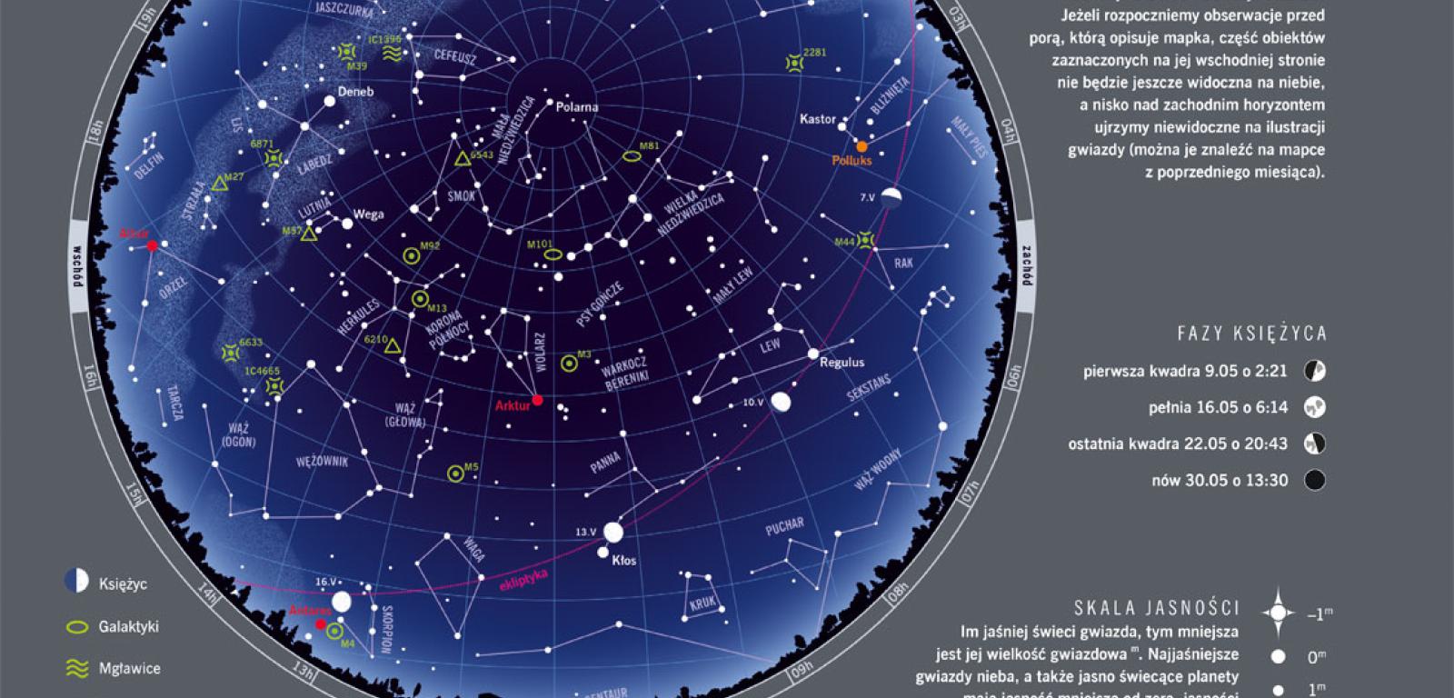 Wiosna w pełnym rozkwicie. Możemy się teraz cieszyć długim i jasnym dniem. Na początku maja Słońce wschodzi o 5:06 i zachodzi o 20:02, pod koniec miesiąca obie te pory przesuwają się ku 4:22 i 20:46. Maksymalna wysokość naszej gwiazdy nad horyzontem rośnie w maju z 52,9° do 59,7°. Jasne są nawet majowe noce: od 17. dnia miesiąca Słońce nawet w najniższym punkcie swej dobowej drogi nie sięga głębokości 18° pod horyzontem. Tymczasem dopiero od tego momentu możemy mówić o nocy astronomicznej – okresie naprawdę ciemnego, najlepszego do poważnych obserwacji nieba.