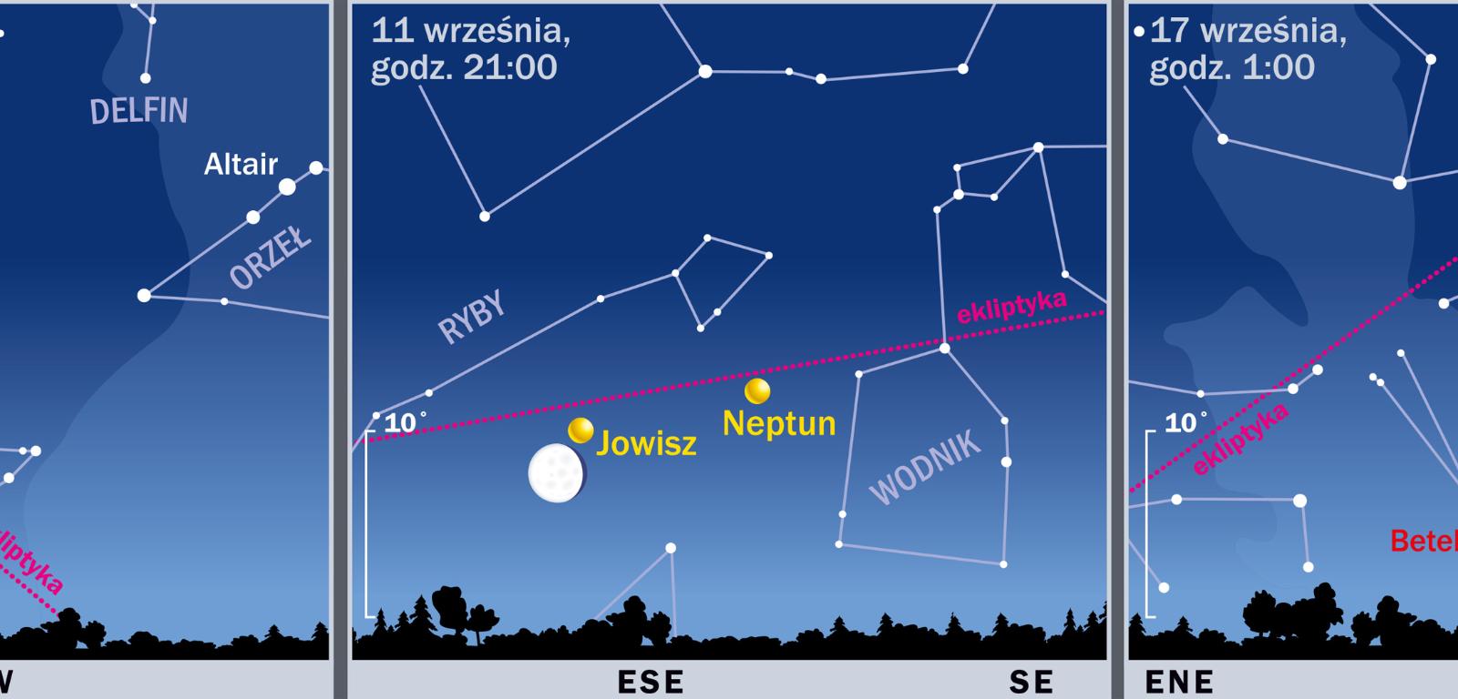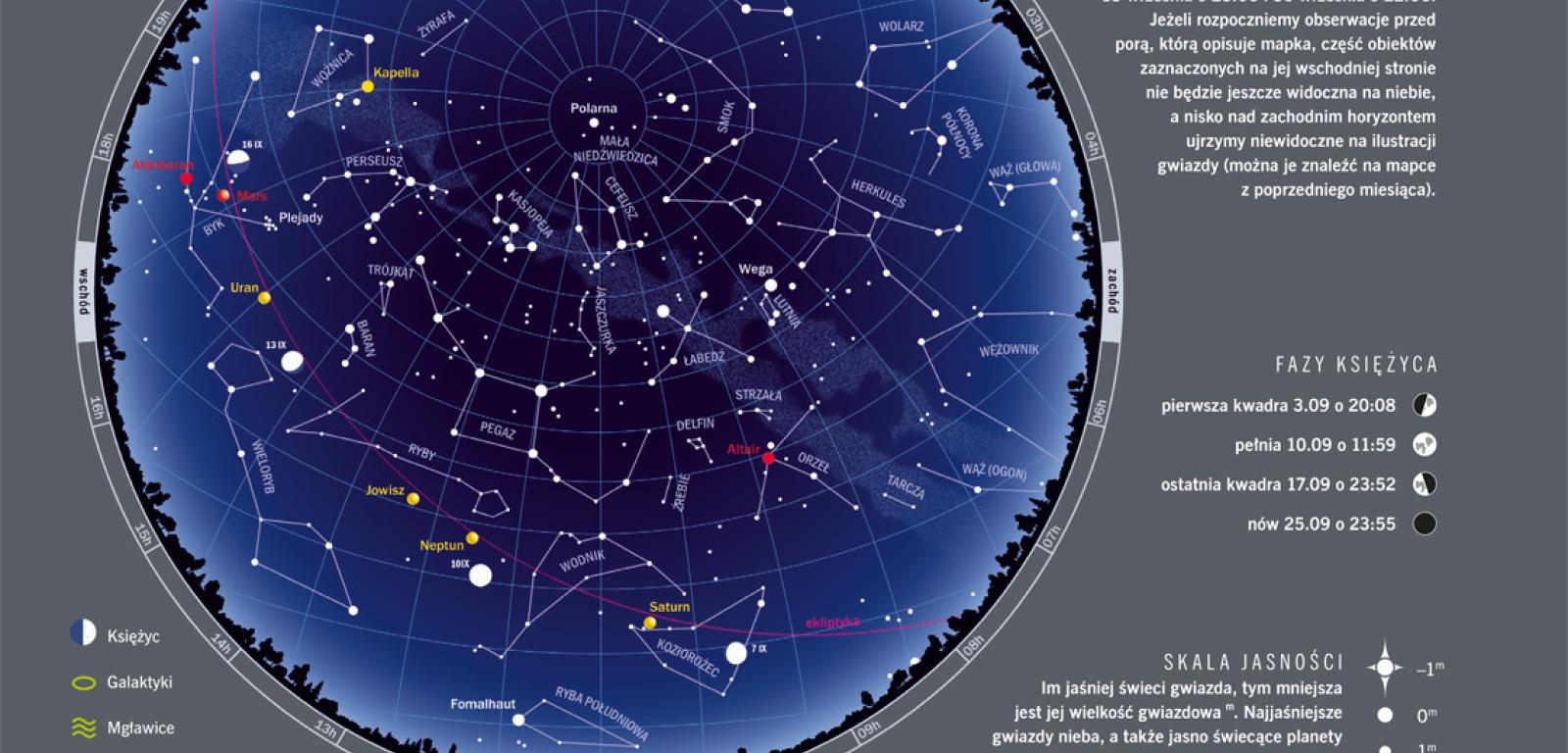 Nadchodzi jesień. W tym roku przyjdzie ona do nas 23.09 o 3:03. Oznacza to, że noc zyskuje powoli przewagę nad dniem: gdy na początku miesiąca czas od wschodu do zachodu Słońca trwa od 5:47 do 19:24, pod koniec września obie te pory przesuwają się ku 6:35 i 18:16. Maksymalna wysokość naszej gwiazdy nad horyzontem maleje we wrześniu od 46° do 34,9°. A co oglądać na wrześniowym niebie? Żegnamy powoli letnie gwiazdozbiory i układy gwiazd – ku zachodowi chylą się więc już Trójkąt Letni, Wolarz i Herkules.