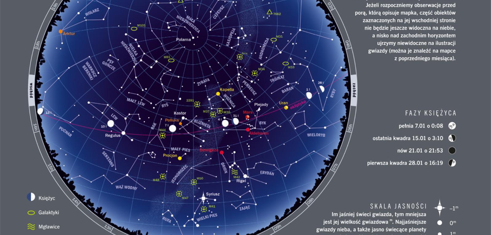 Na początku miesiąca Słońce wschodzi o 7:46, by zajść o 15:34. Pod koniec stycznia obie te pory przesuwają się na 7:19 i 16:21. Maksymalna wysokość Słońca nad horyzontem rośnie z 14,8° do 20,4°. Zmarznięci mogą się też pocieszać wyjątkową bliskością naszej gwiazdy – 4 stycznia o 17:17 Ziemia znajdzie się najbliżej Słońca. Oba ciała będzie wówczas dzieliło zaledwie 147,1 mln km, czyli jakieś 5 mln km mniej niż w lipcu. Długie zimowe noce to okazja do obserwacji rozgwieżdżonego nieba, zwłaszcza że to właśnie zimą jest ono najpiękniejsze.