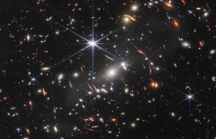 Pierwszym zdjęciem JWST zaprezentowanym przez prezydenta Joego Bidena właśnie w lipcu 2022 r. było ujęcie w podczerwieni gromady galaktyk SMACS 0723, leżącej 4,6 mld l.ś. od nas. Widzimy ją zatem w takim stanie, w jakim znajdowała się 4,6 mld lat temu. Zdjęcie nazwano Pierwszym Głębokim Polem Webba (Webb’s First Deep Field), nawiązując tym samym do słynnego ujęcia teleskopu Hubble’a, zwanego Głębokim Polem Hubble’a, które wiele lat temu ukazywało najdalsze skupiska galaktyk zaobserwowane kiedykolwiek przez oko ludzkie. Na tym obrazie dzięki ogromnej czułości teleskopu Webba wyraźnie widać tzw. efekt soczewkowania grawitacyjnego, czego teleskop Hubble’a raczej by nie dostrzegł. To lekko zakrzywione, krótkie i cienkie bliki świetlne, które są powiększonymi obrazami bardzo dalekich obiektów, znajdujących się jeszcze istotnie dalej za gromadą SMACS, działającą jak soczewka grawitacyjna. Soczewkowane obiekty pochodzą z epoki, gdy wszechświat liczył mniej niż miliard lat.