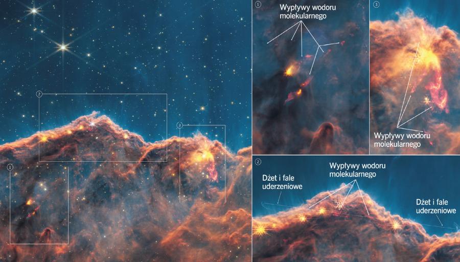 Jednym z niedawnych ważnych odkryć Webba jest zidentyfikowanie ponad 20 wypływów i dżetów wodoru cząsteczkowego na skraju gigantycznej gazowej wnęki wewnątrz gromady gwiazd NGC 3324. Krawędź ta zwana jest też Kosmicznym Klifem. Wypływy i dżety pochodzą z bardzo młodych gwiazd, dopiero co utworzonych, a nawet znajdujących się w trakcie narodzin. Gdy powstając, zaciągają z otaczających je dysków gazu i pyłu materię, jej część wyrzucają w przestrzeń, by spowolnić swój moment pędu. I te ślady istnienia noworodków gwiezdnych, dotąd niewidoczne dla nas, odkrył teleskop Webba (patrz zdjęcie poniżej).