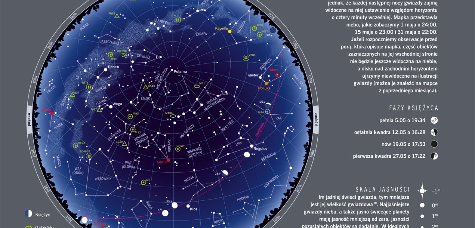 Wiosna w pełnym rozkwicie. Dzień jest równie długi jak na przełomie lipca i sierpnia: gdy na początku maja Słońce wschodzi o 5:07 i zachodzi o 20:01, pod koniec miesiąca obie te pory przesuwają się ku 4:22 i 20:46. Maksymalna wysokość naszej gwiazdy nad horyzontem rośnie w maju z 52,8° do 59,7°. Coraz krótsza noc robi się też coraz jaśniejsza, ponieważ Słońce nawet o północy nigdy nie jest głęboko pod horyzontem. Od 17 maja w najniższym punkcie swej dobowej drogi nie sięga głębokości 18° pod horyzontem, co oznacza, że nie zapada najlepsza do obserwacji słabych obiektów noc astronomiczna.
