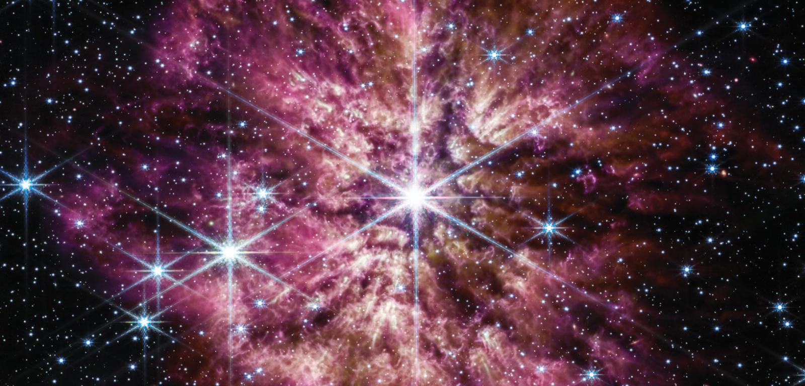 Ostatnio Kosmiczny Teleskop Jamesa Webba (JWST) uzyskał rzadki obraz jednego z takich olbrzymów, tzw. gwiazdy Wolfa-Rayeta, w przelotnej końcowej fazie jego życia. Gwiazda ta, określana jako WR 124, jest 30 razy masywniejsza od Słońca, lecz w szybkim tempie traci materię, wyrzucając gorący gaz w przestrzeń kosmiczną. „Uchwyciliśmy ją na wczesnym etapie – mówi Anthony Moffat, który zajmuje się gwiazdami Wolfa-Rayeta od dziesięcioleci i nie nie brał udziału w najnowszych obserwacjach JWST.