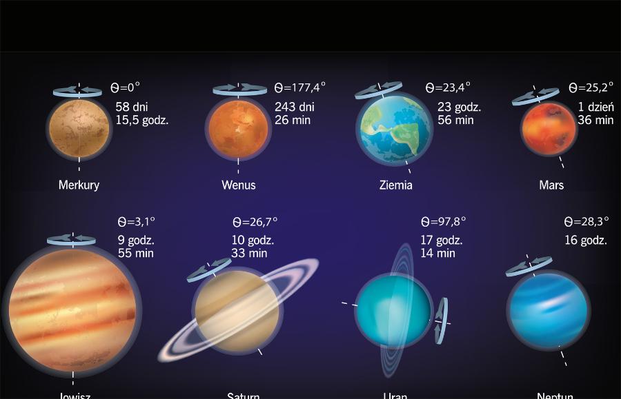 Uran okrąża Słońce raz na 84 lata i jest pochylony inaczej niż pozostałe planety naszego układu. Kąt między osią obrotu a prostopadłą do ekliptyki wynosi aż 97,77°. Uran obraca się więc tak, jakby leżał całkowicie na boku – niemal w płaszczyźnie Układu Słonecznego. Nie do końca wiadomo, skąd to ogromne nachylenie (np. w przypadku Ziemi to tylko nieco ponad 23°, pozostałe planety też są lekko nachylone), przypuszcza się jedynie, że zostało ono wywołane kolizją Urana z jakimś dużym ciałem w okresie formowania się Układu. W rezultacie pory roku na tej planecie wyglądają zupełnie inaczej niż w przypadku pozostałych. Najbardziej wystawione na działanie Słońca są bieguny, a nie okolice równikowe, przy czym dla każdego z biegunów zarówno noc polarna, jak i dzień polarny trwają po 42 lata. Notabene temperatura w okolicach równika jest wyższa niż w obszarach okołobiegunowych, co wciąż pozostaje zagadką.