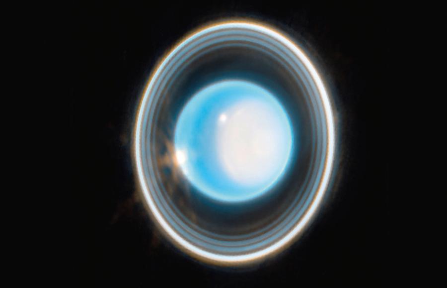 Z kolei w końcu marca br. Urana obserwował nasz najpotężniejszy teleskop kosmiczny, czyli James Webb Space Telescope. Kiedy Voyager 2 spojrzał na Urana, jego kamera ukazała prawie pozbawioną cech charakterystycznych jednolitą niebieskozieloną kulę. Teraz teleskop Webba dostrzegł bardzo wyraźnie strukturę pierścieni planety, w tym dwa pierścienie pyłowe, oraz jej biegun północny. Obecnie na biegunie tym panuje wiosna, a lato rozpocznie się w 2028 r. Z kolei biegun południowy znajduje się „po ciemnej stronie” planety. Webb dostrzegł też wyraźne jego centralne pojaśnienie, będące czapą polarną. Na krawędzi czapy znajduje się bardzo jasna chmura, a także tuż za tą krawędzią – kilka słabszych rozszerzonych struktur. Druga jasna i wyraźna chmura leży na lewej krawędzi planety. Te struktury atmosferyczne są prawdopodobnie wynikiem aktywności burzowej Urana. Obserwacja trwała tylko 12 min. Uczeni uważają więc, że to zaledwie wierzchołek góry lodowej tego, co James Webb Space Telescope może dokonać, obserwując tajemniczy obiekt.