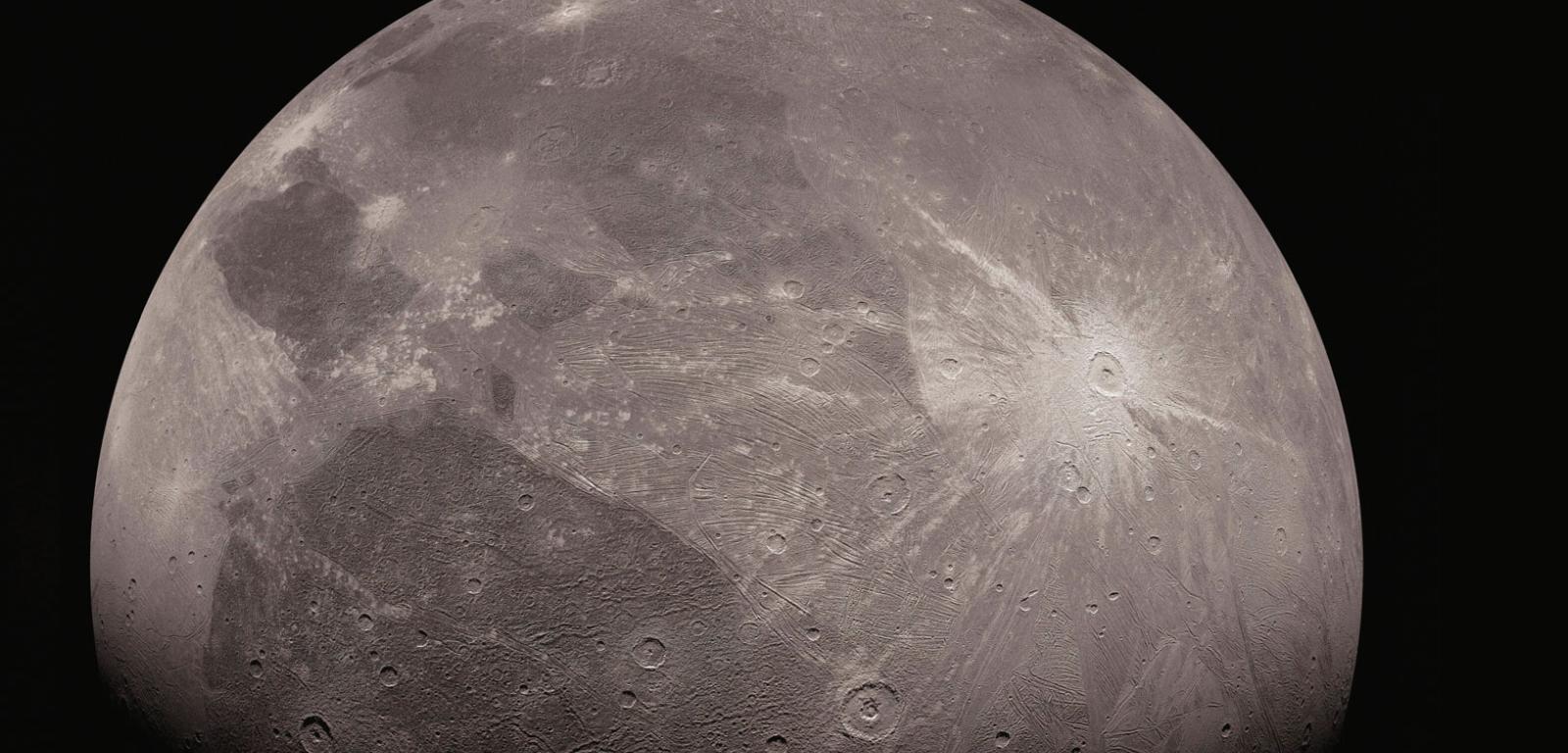 Ganimedes to największy księżyc w Układzie Słonecznym, większy nawet od Merkurego. Ale skład chemiczny obu ciał jest zupełnie inny: podczas gdy Merkury to planeta skalista z nieproporcjonalnie dużym metalicznym jądrem, Ganimedes to zapewne świat skalno-lodowy, a jego powierzchnię stale bombarduje strumień cząstek naładowanych, rozpędzanych przez potężne pole magnetyczne Jowisza.