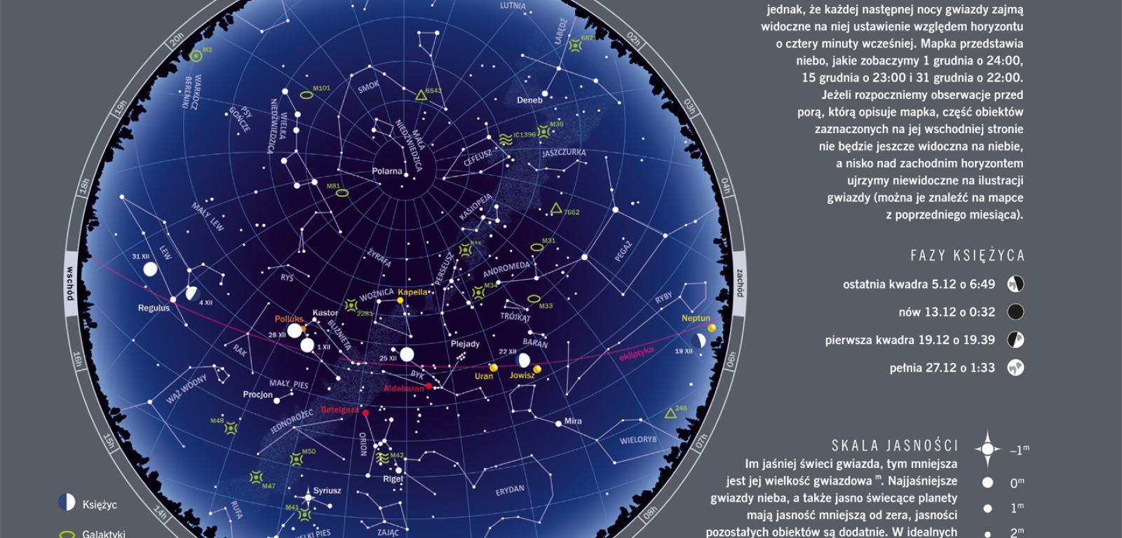 Zima zaczyna się w tym roku 22 grudnia o 4:27. Pierwszy zimowy dzień, najkrótszy w roku, potrwa od 7:44 do 15:26. Tego dnia w południe słońce wzniesie się na wysokość zaledwie 14,3°. Długie noce ułatwią chętnym wypatrywanie pierwszej gwiazdki. Co będzie nią w tym roku? Tym razem sytuacja jest jednoznaczna: jeśli wypatrujemy jasnego gwiazdopodobnego punktu, niemal na pewno naszą pierwszą gwiazdką zostanie Jowisz. Planeta będzie widoczna na niebie wkrótce po zachodzie Słońca, a zajdzie dopiero po północy.