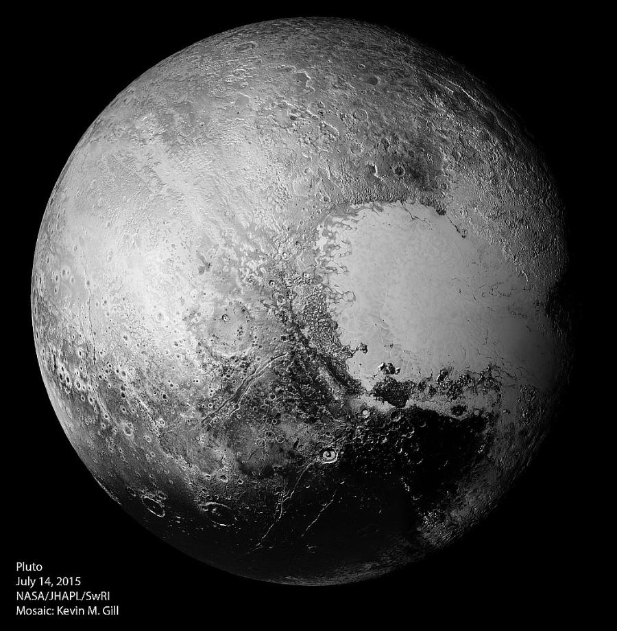 Cała planeta karłowata Pluton składa się ze skał i lodu, głównie azotowego. Azot w warunkach ziemskich jest gazem, ale schłodzony do –195 st. C ulega skropleniu, a w temperaturze poniżej –210 stopni – zestaleniu. Na Plutonie jest wiele miejsc, w których widać, że płynny azot przebijał spod powierzchni i utworzył na niej liczne ślady w postaci dolin, wzniesień i uskoków. Powierzchnia transneptuna jest mocno zróżnicowana i spękana (co świadczy o bogatej przeszłości), pokryta ciemnymi i jasnymi obszarami oraz przeraźliwie zimna (210–235 stopni poniżej zera). Atmosfera metanowo-azotowa jest rozrzedzona, wysoka i cieplejsza od powierzchni.