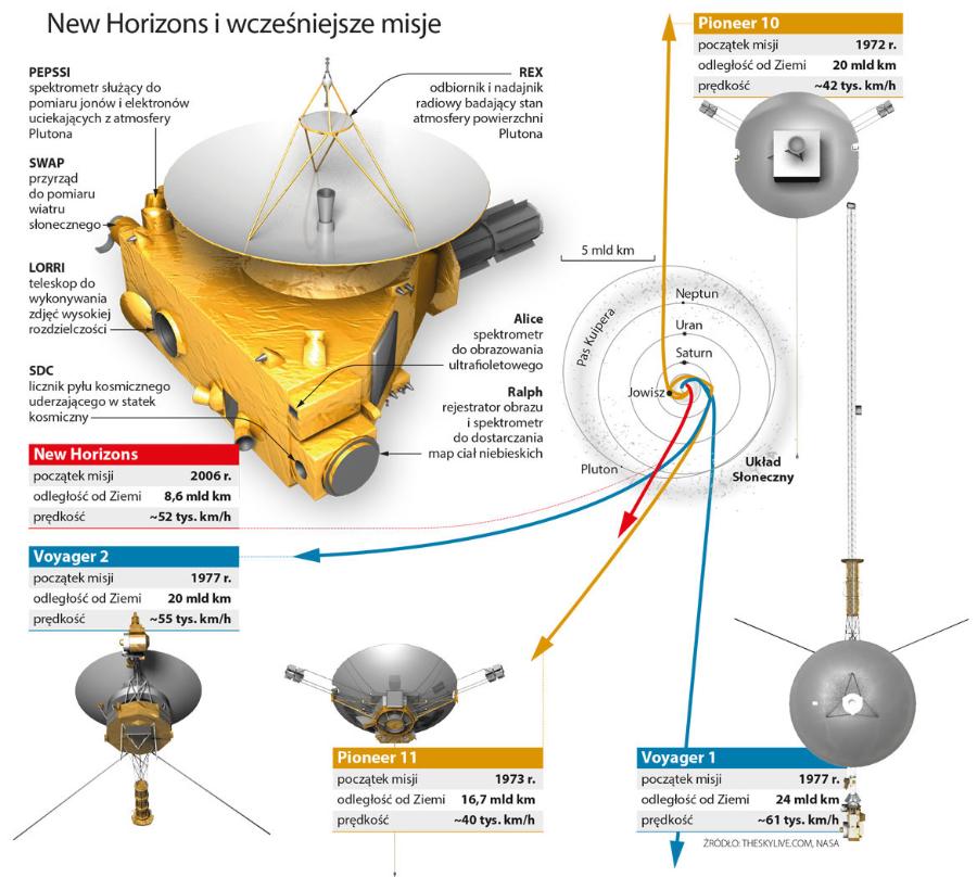Sonda New Horizons, wysłana, by dokładnie zbadać system Plutona, nie jest oczywiście pierwszą, która opuści nasz Układ Słoneczny na zawsze, by mknąć w nieskończoność. Już wcześniej – w latach 2012 i w 2018 – zrobiły to sondy Voyager 1 i Voyager 2, które są teraz najdalej w przestrzeni (odpowiednio 24 i 20 mld km). Wkrótce z naszego kosmicznego podwórka znikną także Pioneer 10 i 11 – dwie sondy NASA z początku lat 70. XX w. New Horizons jest jednak wyjątkowa.