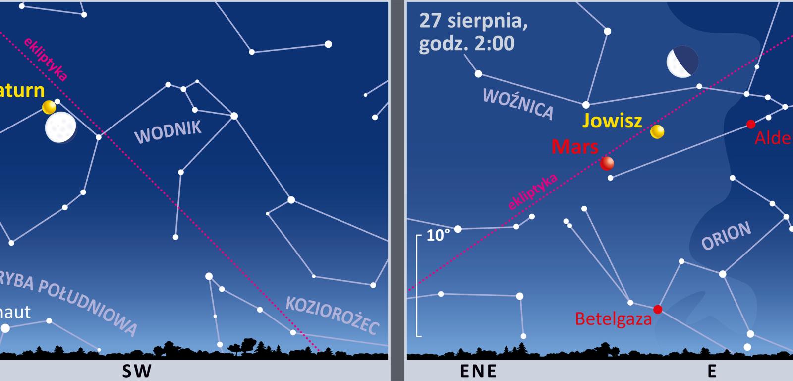 Księżyc w pobliżu Saturna w Wodniku zobaczymy 21 sierpnia nad ranem. 27 sierpnia podziwiajmy Srebrny Glob tuż obok Jowisza i Marsa w Byku.