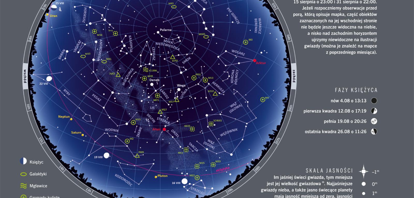 Lato, ale powoli chylące się ku jesieni. Dzień jest coraz krótszy. Na początku miesiąca Słońce wschodzi o 4:58, by zajść o 20:26, a pod koniec obie te pory przesuwają się ku 5:46 i 19:25. Maleje też maksymalna wysokość Słońca nad horyzontem z 55,6° do 46,1°. Sierpień jak co roku kusi nas Perseidami. Maksimum tego spektakularnego roju przypada zwykle w okolicy 12. dnia miesiąca. Perseidy pochodzą z komety 109P/Swift-Tuttle. Obiekt ten, o średnicy 26 km, powróci do nas zza orbity Plutona dopiero w 2126 r., ale każdego sierpnia możemy podziwiać pozostawione przez niego odłamki wpadające w ziemską atmosferę. Na obserwacje najlepiej wybrać się w drugiej połowie nocy. W tym czasie zajdzie już znajdujący się w pierwszej kwadrze Księżyc. Przy dobrych warunkach spodziewajmy się widoku ok. 60 meteorów w ciągu godziny. A jeśli pogoda nie dopisze? Na obserwacje można wybrać się też innej nocy, Perseidy promieniują zwykle od 17 lipca do 24 sierpnia. Nie zapomnijmy o sprayu na komary!