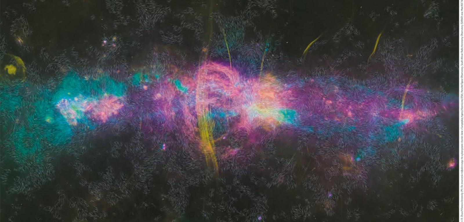 Chuss i jego zespół badali pył kosmiczny za pomocą Stratospheric Observatory for Infrared Astronomy, teleskopu NASA, który prowadził obserwacje w podczerwieni z samolotu lecącego na wysokości 14 km. Pola magnetyczne powodują, że fale świetlne emitowane przez pył orientują się w określony sposób, co nadaje temu światłu właściwość zwaną polaryzacją – zatem pomiar polaryzacji może ujawnić magnetyzm w otaczającej przestrzeni. Fizyk z Villanova University Dylan Paré i jego współpracownicy przekształcili dane uzyskane z teleskopu do formy nadającej się do wizualnej reprezentacji, a Kaitlyn Karpovich, wówczas jeszcze studentka, stworzyła barwne tło, wykorzystując dane z dodatkowych teleskopów dotyczące temperatury i dyspersji pyłu. Kolory symbolizują różnice temperatury – niebieski i fioletowy oznaczają odpowiednio zimny i ciepły pył, a żółty gorący gaz. Drobne, zawijające się szare linie reprezentują pole magnetyczne. „Wciąż jestem zdumiony złożonością tego pola – mówi Chuss. – Często wpatruję się w tę mapę i za każdym razem dostrzegam w niej nowe rzeczy”. Astronomka Roberta Paladini z California Institute of Technology twierdzi, że badanie pyłu Drogi Mlecznej może naświetlić skomplikowaną interakcję między grawitacją a magnetyzmem, pozwalając naukowcom ustalić, kiedy i dlaczego obłoki pyłu kolapsują, tworząc gwiazdy. „Dopóki obie te siły pozostają w równowadze, obłok się nie zapada – mówi. – Ale w pewnym momencie grawitacja zawsze bierze górę – a badanie pól magnetycznych umożliwi nam poznanie, kiedy faktycznie dochodzi do kolapsu i powstania gwiazd”.