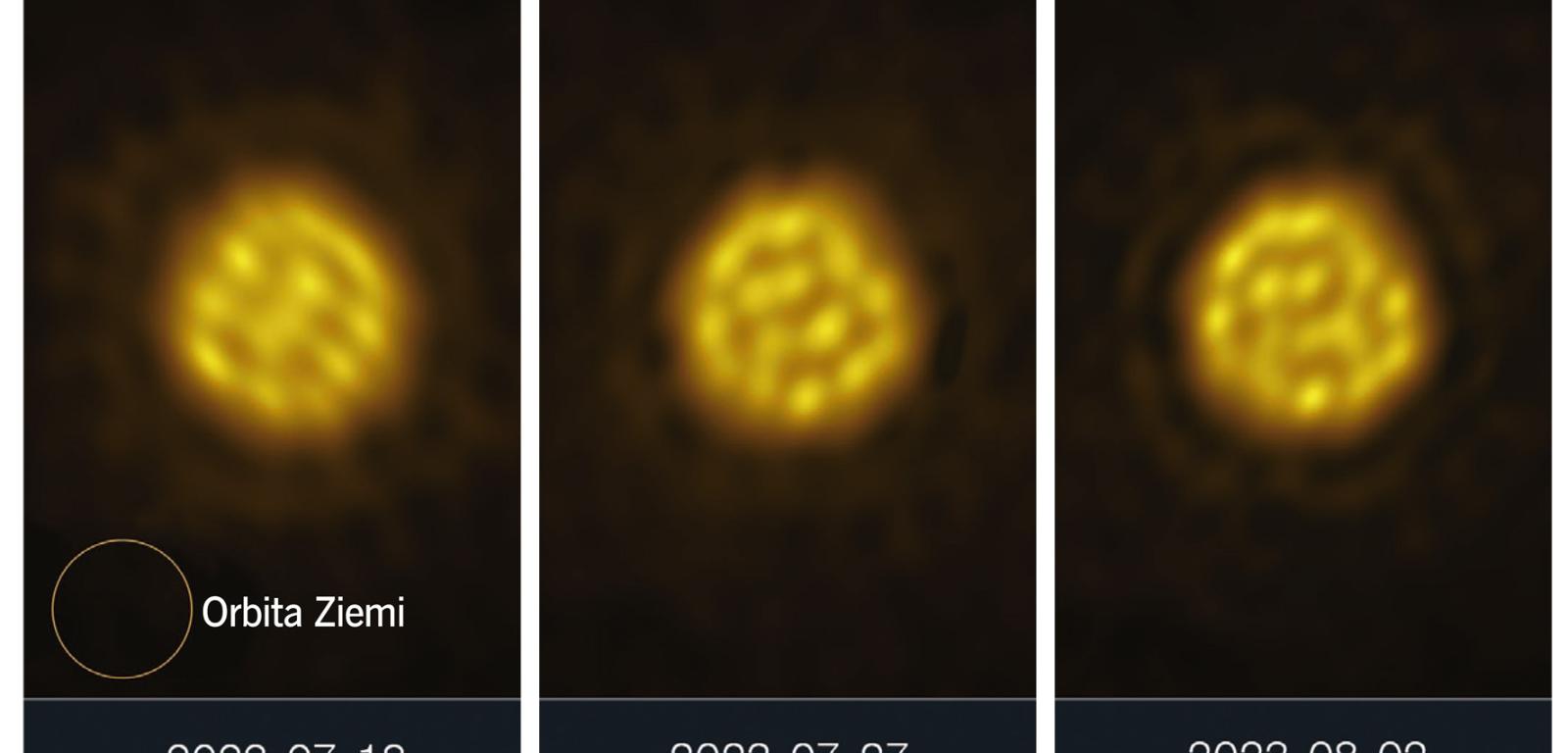 R Doradus, bo to o niej mowa, nie jest niestety widoczna z Polski – dalekie słońce można obserwować na południowym niebie na tle gwiazdozbioru Złotej Ryby. Ale może bohaterkę tego artykułu uda się zobaczyć przy okazji jakiejś podróży w bardziej południowe rejony? Gwiazda od dawna budzi zainteresowanie badaczy. To jej tarcza zajmuje największy po Słońcu obszar na ziemskim niebie. W szczególności R Doradus przewyższa tu o ponad 30% Betelgezę, inną rekordzistkę wśród gwiazd. To zwycięstwo wynika z aż dwóch czynników: R Doradus jest niezbyt odległa – dzieli ją od nas ok. 178 l.św. – ale też po prostu bardzo duża. Jest mniej więcej 370 razy większa od Słońca, czyli ma średnicę ponad 515 mln km. Gdyby została umieszczona w centrum Układu, jej powierzchnia sięgałaby poza orbitę Marsa. Chociaż znane są jeszcze większe gwiazdy – np. wspomniana Betelgeza – żadna nie wydaje się tak duża na niebie, ponieważ wszystkie są w większej odległości od nas.