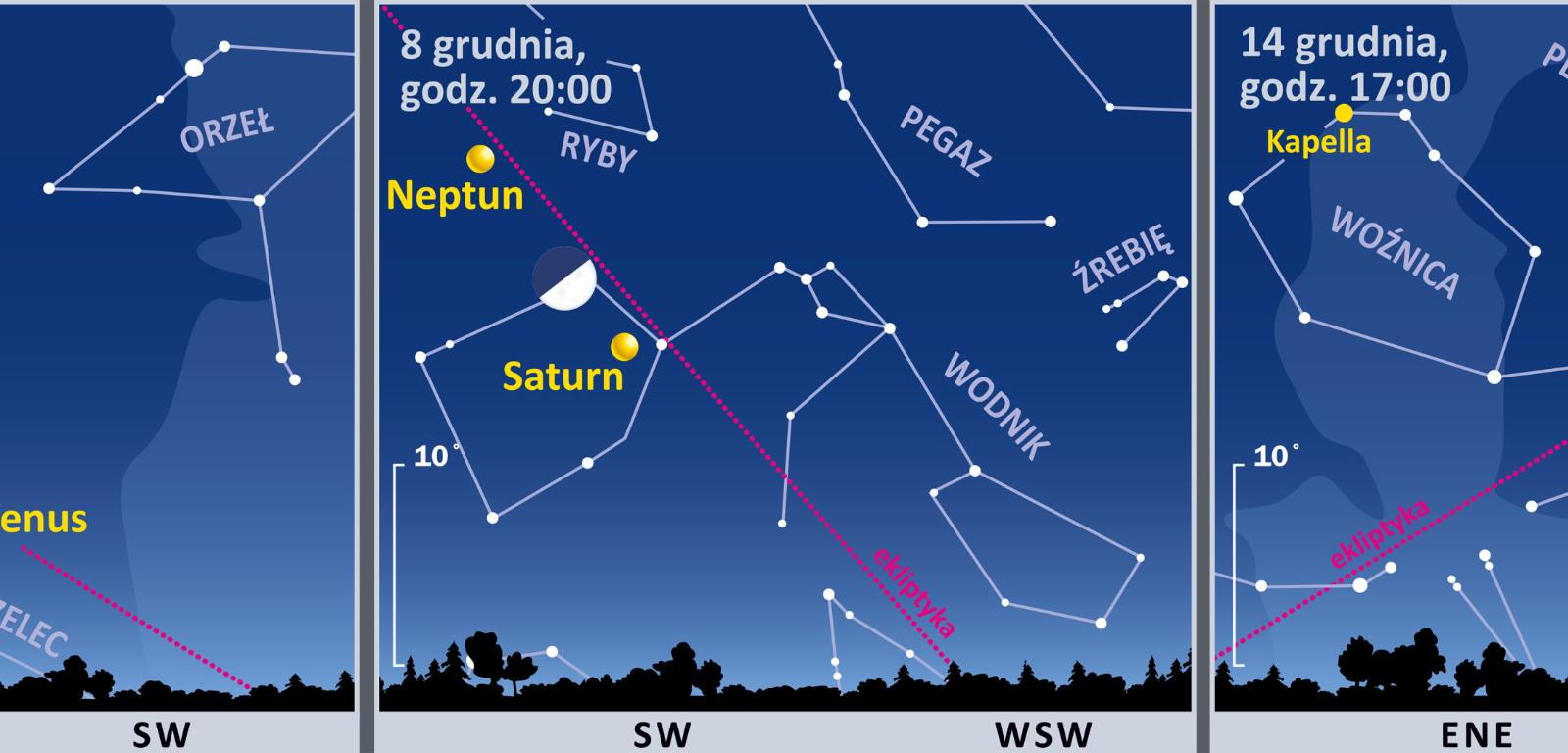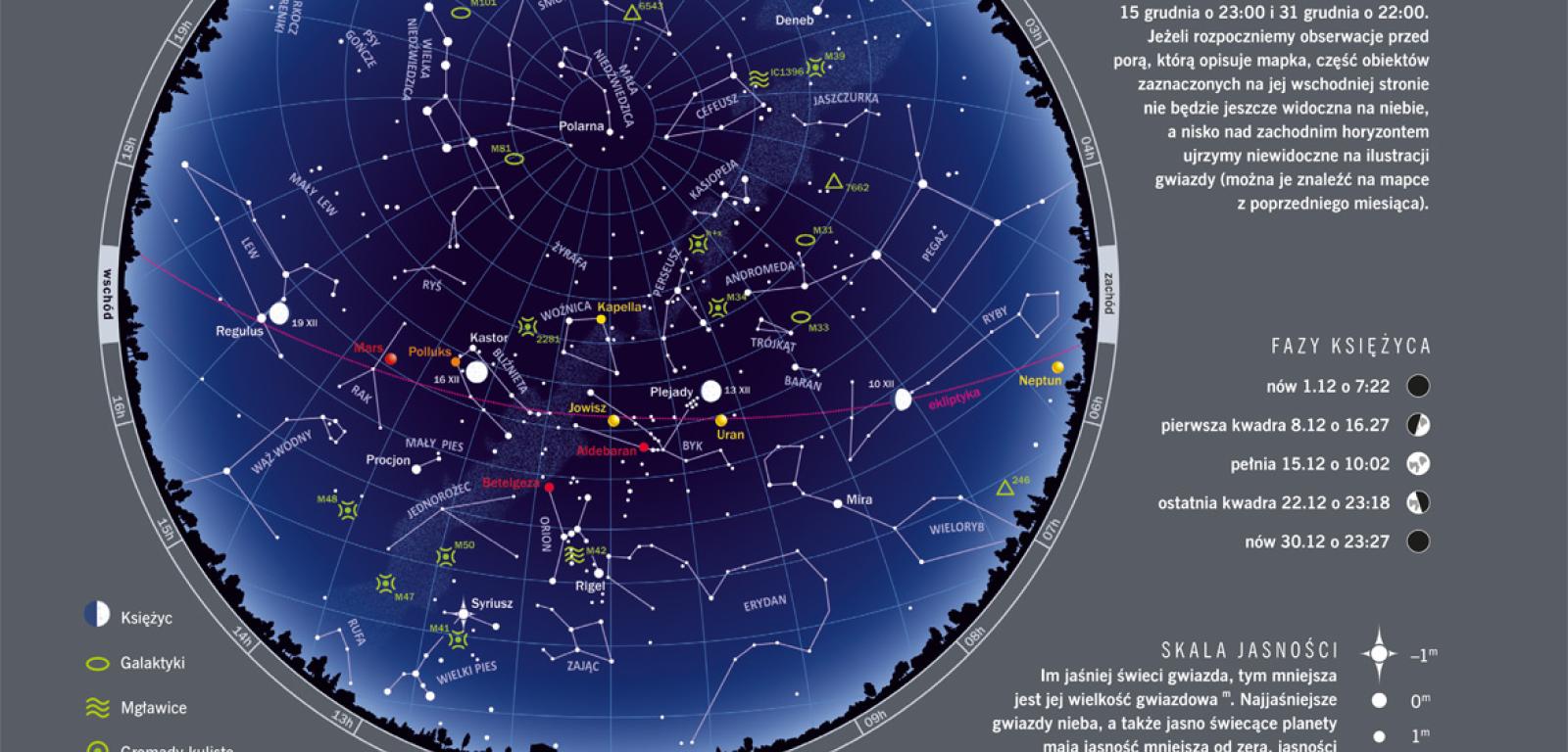 Ostatni miesiąc roku oznacza początek prawdziwej zimy. Nadejdzie ona 21 grudnia o 10:20. W okolicy tego dnia doświadczymy najdłuższych nocy w roku: dzień potrwa tylko od 7:43 do 15:25 (dane dla Warszawy – im dalej na północ, tym noc dłuższa). Maksymalna wysokość Słońca nad horyzontem zmieni się z 15,9° na początku miesiąca do 14,7° w sylwestra, a na samym początku zimy wyniesie zaledwie 14,3°. Święta to czas, w którym wiele osób będzie wypatrywało pierwszej gwiazdki. Jeśli nastawiamy się na prawdziwe gwiazdy, wybór będzie podobny jak każdego roku – wschodzący Aldebaran, widoczna na północnym niebie Kapella i unosząca się wysoko nad północno-zachodnim horyzontem Wega.