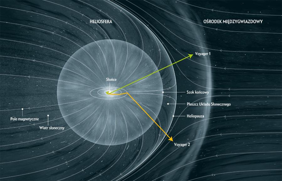W trakcie swojej wędrówki ku przestrzeni międzygwiazdowej Voyagery musiały przekroczyć wiele granic: najpierw szok końcowy w odległości około 7 lub 8 mld km od Słońca, gdzie wiatr słoneczny gwałtownie zaczyna zwalniać, a następnie heliopauzę, gdzie ciśnienie zewnętrzne wiatru słonecznego jest równe ciśnieniu ośrodka międzygwiazdowego. Pomiędzy tymi dwoma wyraźnymi granicami znajduje się płaszcz Układu Słonecznego, czyli region, w którym materia słoneczna nadal zwalnia, a nawet zmienia kierunek. Wędrówka przez te granice zajęła Voyagerowi 1, szybszej z bliźniaczych sond, prawie osiem lat; tak ogromna jest skala tej gry.