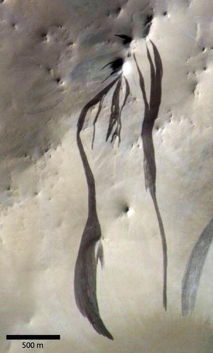 Wygląd, rozmiary i lokalizację poszczególnych smug zestawiono następnie z całą masą zbieranych na Marsie danych dotyczących m.in. zmian temperatury, kierunków wiatru, procesów przemieszczania się luźnego materiału po pochyłościach, czy też orientacji względem stron świata oraz nachylenia zboczy. Z analiz tych wynika, że powstawanie ciemniejszych pasm nie ma nic wspólnego z wodą, natomiast ma wiele wspólnego z wiatrem. „Formy te powstają w miejscach, gdzie silniejszy wiatr akumuluje drobny pył, który w pewnym momencie zaczyna się zsuwać po stromiznach – komentuje Valantinas. – W takich miejscach nie ma ani grama wody. Wszystko jest suche jak pieprz”.