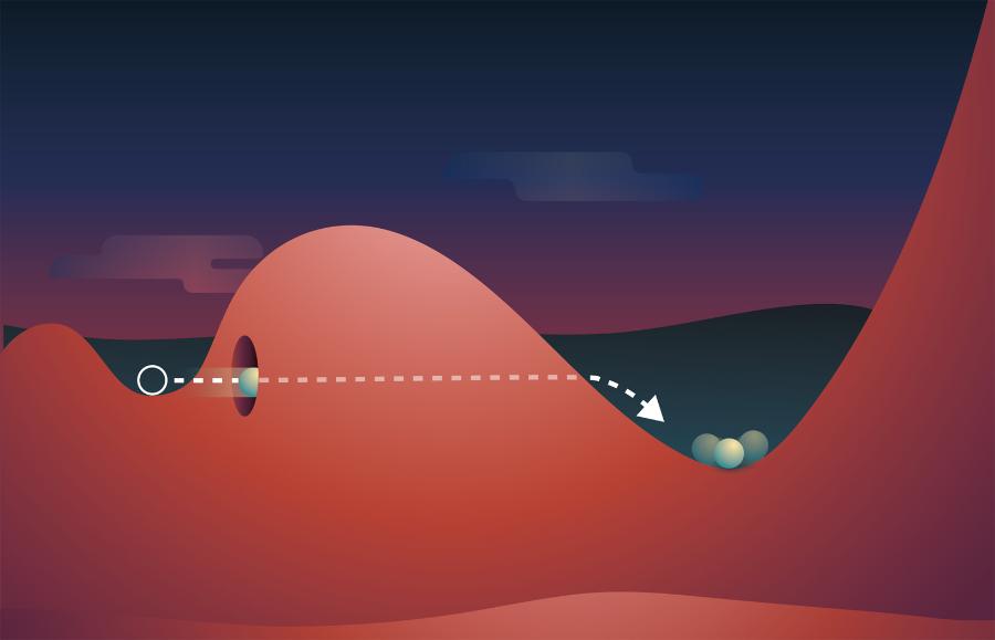 Mogłoby się wydawać, że dotarcie do drugiej doliny jest prawie niemożliwe. Najpierw musielibyśmy wtoczyć nasz metaforyczny głaz na wzgórze, z którego stoczyłby się po drugiej stronie do głębszej doliny. Ale fizyka kwantowa może sprawić, że niemożliwe staje się możliwe. Dzięki efektowi zwanemu tunelowaniem kwantowym pole może losowo przeskoczyć z ustawienia o wyższej energii do ustawienia o niższej energii, nawet jeśli brakuje mu energii, aby wspiąć się na wzgórze pomiędzy nimi. To tak, jakby przejechać przez tunel we wzgórzu, zamiast podróżować po jego grzbiecie. Gdyby tak się stało z polem Higgsa, skończyłaby się nasza fałszywa próżnia i wyłoniłaby się próżnia prawdziwa.