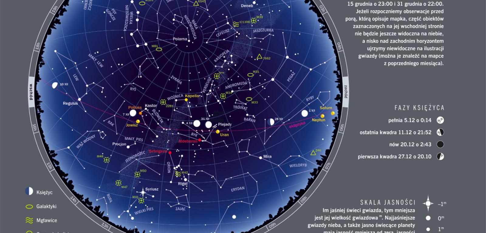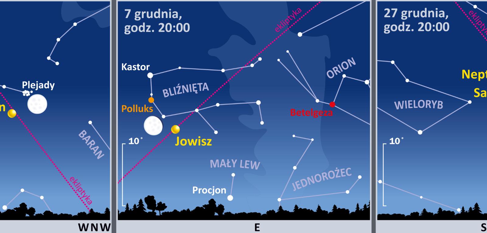 Pogoda już od jakiegoś czasu sugeruje zmianę pory roku: zima przyjdzie do nas w tym roku 21 grudnia o 16:02. Tego dnia Słońce wschodzi o 7:43, by zajść już o 15:25. Najkrótszy dzień i najdłuższa noc wieszczą przełom, od którego powoli zaczniemy się już zbliżać ku wiośnie. Ale na razie czas na tradycje zimowe. Coroczne poszukiwania pierwszej gwiazdki urozmaicą nam w tym roku planety. Wkrótce po zachodzie Słońca na południowym niebie zobaczymy Saturna. Po 18:00, jeśli tylko mamy widok na zachodni horyzont, blask pierwszej gwiazdki przedrze się nawet przez niezbyt gęste chmury, bo będzie nią bardzo jasny Jowisz.