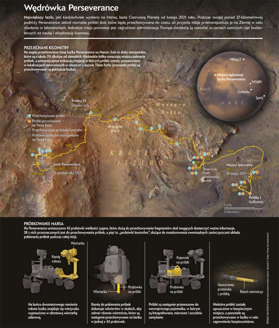 Ale podróż Cheyava Falls na naszą planetę może się nie powieść. Łazik Perseverance stanowi pierwszą fazę wieloetapowej misji mającej na celu sprowadzenie fragmentów Marsa na Ziemię, znanej jako Mars Sample Return (MSR), a jej kolejny krok stoi pod znakiem zapytania. Administracja Trumpa zasugerowała odwołanie etapu powrotu. W chwili oddawania tego artykułu do druku los misji zależy od Kongresu Stanów Zjednoczonych.