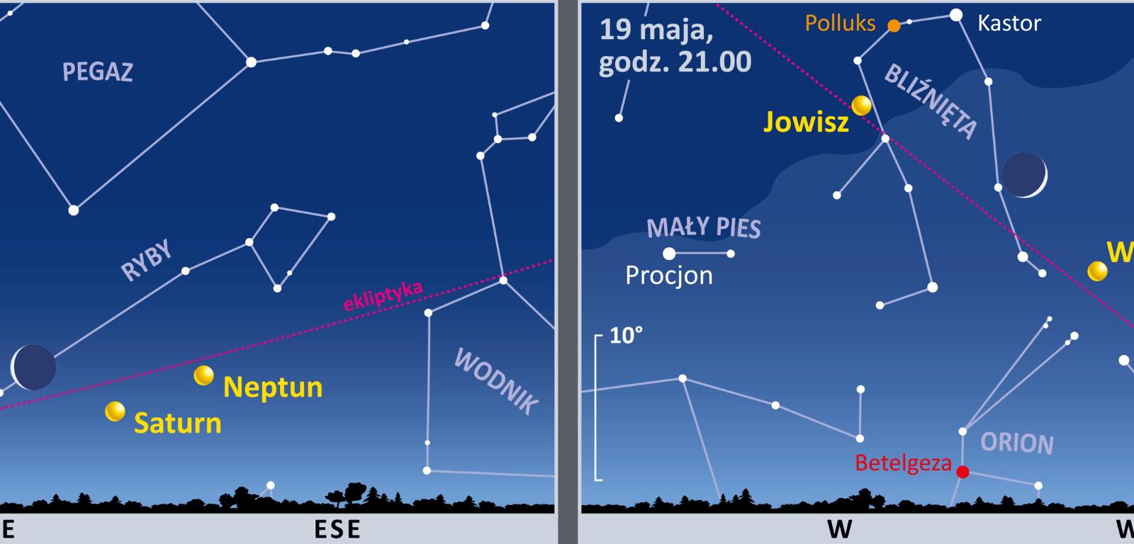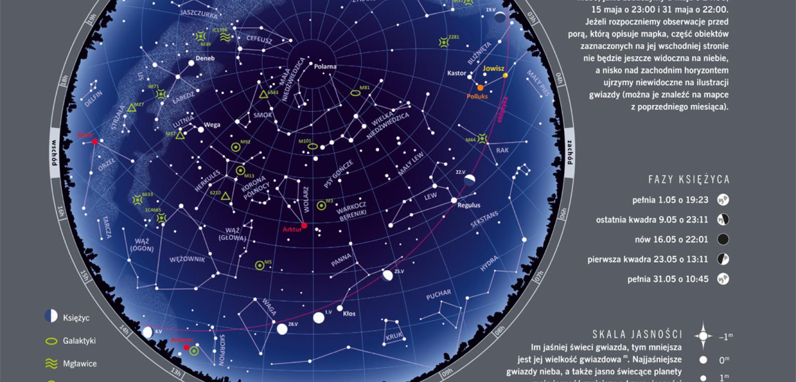 Trwa wiosna w pełnym rozkwicie. Długość dnia nadal rośnie: gdy na początku miesiąca Słońce wschodzi o 5:06 i zachodzi o 20:02, pod jego koniec obie te pory przesuwają się na 4:22 i 20:47. Maksymalna wysokość naszej gwiazdy nad horyzontem również rośnie – z 52,9° do 59,7°. Nas jednak przede wszystkim interesują noce. W maju ciemne niebo zostanie rozświetlone przez kilka meteorytowych rojów. Jeden z nich pochodzi od najsłynniejszej z komet. To eta Akwarydy – wpadające w ziemską atmosferę drobne odłamki pozostawione na torze przez Kometę Halleya.