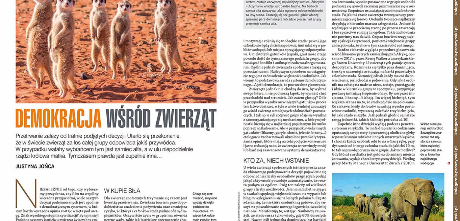 Jestem stałym czytelnikiem „Wiedzy i Życia” od lat 70., gdy ukazywała się ona jeszcze w małym formacie. W numerze 1028 zainteresował mnie artykuł pani Justyny Jońcy „Demokracja wśród zwierząt”. Na bazie spostrzeżeń tam sygnalizowanych dowiadujemy się ciekawych informacji o podejmowaniu wspólnych „społecznych” decyzji w grupie zwierząt. Decyzja przywódcy odgrywa ważną rolę, ale i on zmienia zdanie, gdy większość np. żubrów lub jeleni decyduje się iść w innym kierunku.