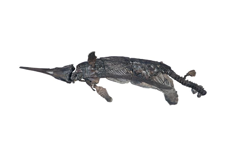 Skamieniałe szczątki smukłego trzymetrowego morskiego stworzenia o pysku długim jak miecz, z drobnymi zębami i potężnymi szczękami, zostały znalezione na wybrzeżu południowej Anglii. Zwierzę to otrzymało nazwę Xiphodracon goldencapensis – od greckich słów xiphos (miecz) i drakon (smok) – co doskonale oddaje jego wygląd. To najbardziej kompletny okaz ichtiozaura z pliensbachu (wczesna jura), jaki kiedykolwiek odkryto (zachował się w osadach formacji Charmouth). Wyróżnia się wyjątkową anatomią: miał kość łzową – niewielki element czaszki położony między oczodołem a nozdrzami – zaopatrzoną w charakterystyczne wypustki, które prawdopodobnie wzmacniały przednią część pyska lub stanowiły miejsce przyczepu tkanek miękkich. Jego szczęka była niezwykle rozbudowana, tworząc niemal cały dolny brzeg nozdrzy, podczas gdy u większości ichtiozaurów ten fragment budowało kilka różnych kości. To rzadkie rozwiązanie świadczy o wyspecjalizowanej budowie pyska tego gatunku. Na jego kościach zachowały się również ślady urazów – złamania, martwicze zmiany i zniekształcone zęby – sugerujące burzliwe życie i możliwe starcia z większymi drapieżnikami. (ji)