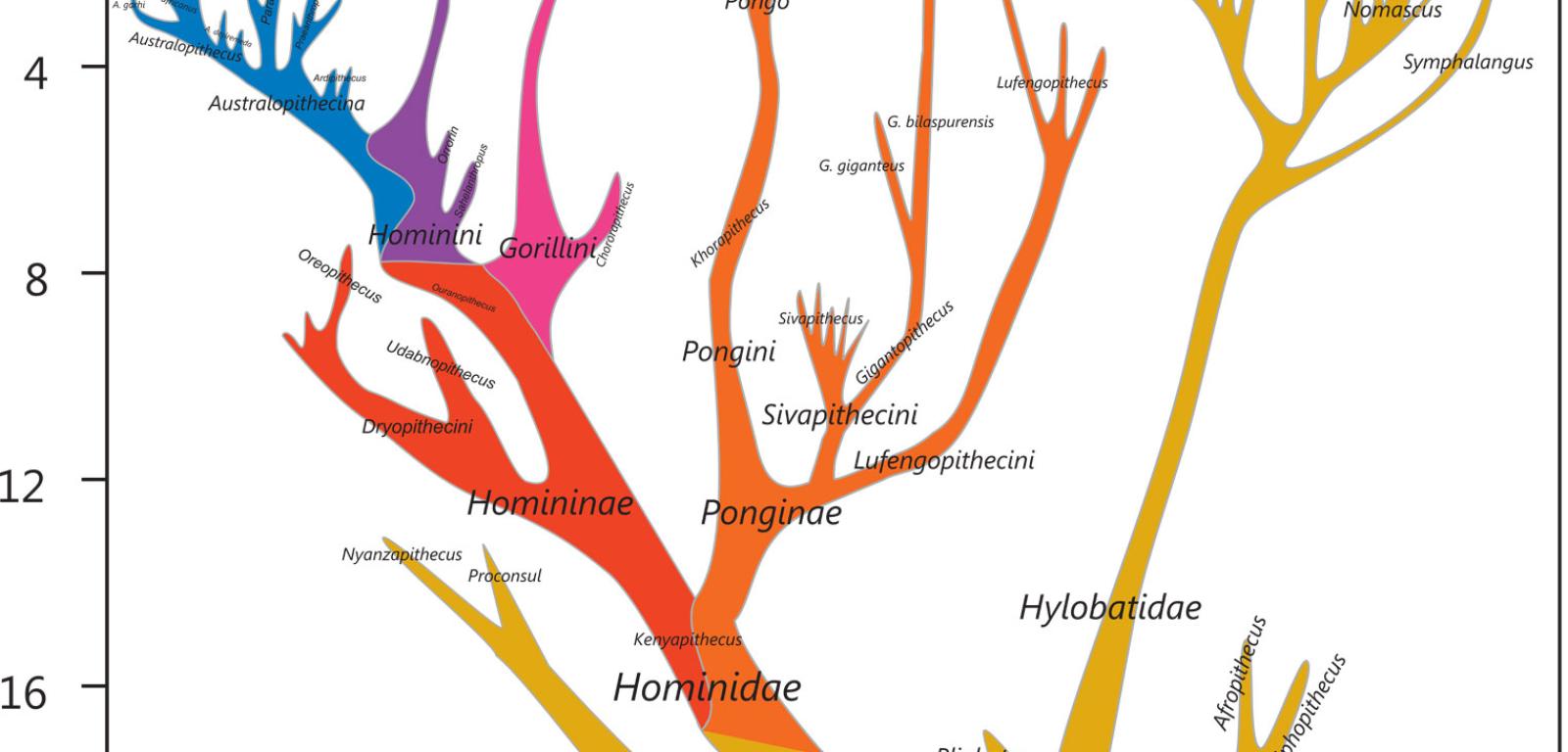 Pogląd ten runął za sprawą biologii molekularnej. Okazało się, że ludzkie DNA w znikomym stopniu różni się od DNA szympansa czy goryla. Jak zauważył paleontolog Richard Fortey: „Jesteśmy do siebie podobni bardziej niż dwa gatunki małży należące do tego samego rodzaju”. Analizy wykazały, że DNA szympansa jest w 99%, a DNA goryla w 98% identyczne z naszym. Za pomocą techniki zegara molekularnego, opierającej się na założeniu, że zmiany w DNA zachodzą w mniej więcej stałym tempie, stwierdzono, że ostatni wspólny przodek człowieka i dwóch wielkich małp afrykańskich, czyli szympansa i goryla, żył na Ziemi 5–8 mln lat temu. Najpierw swoją drogą poszły goryle, potem szympansy. Jeszcze wcześniej, 10–12 mln lat temu, oddzieliły się azjatyckie orangutany, których DNA jest jednak wciąż w 97% identyczne z naszym. Stało się oczywiste, że człowiek i trzy wielkie małpy człekokształtne tworzą jedną biologiczną rodzinę. Współczesne goryle, szympansy i orangutany oraz ich wymarłe formy stały się tak jak my hominidami. Jedynie mniejsze gibony, które podążyły własną drogą już 15–20 mln lat temu, wydały się biologom nie dość człowiekowate. Stworzono dla nich odrębną rodzinę – gibonowatych.