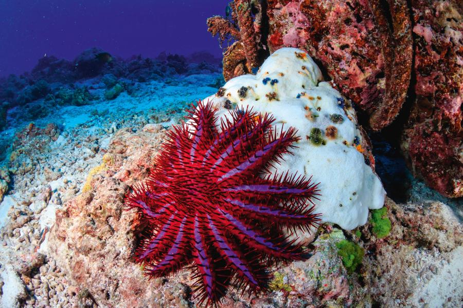 Kolejny wróg koralowców to rozgwiazdy. Pożerają one polipy, pozostawiając jedynie wapienny szkielet, który z czasem się rozpada. Panoszą się na rafach, bo zanieczyszczenie wód doprowadziło do wytrzebienia populacji trytonów – wielkich morskich ślimaków będących naturalnymi wrogami rozgwiazd. Od połowy XX w. zaobserwowano gwałtowny wzrost liczebności populacji rozgwiazd z gatunku korona cierniowa, których pojedynczy osobnik pożera od 5 do 13 m2 rafy rocznie.