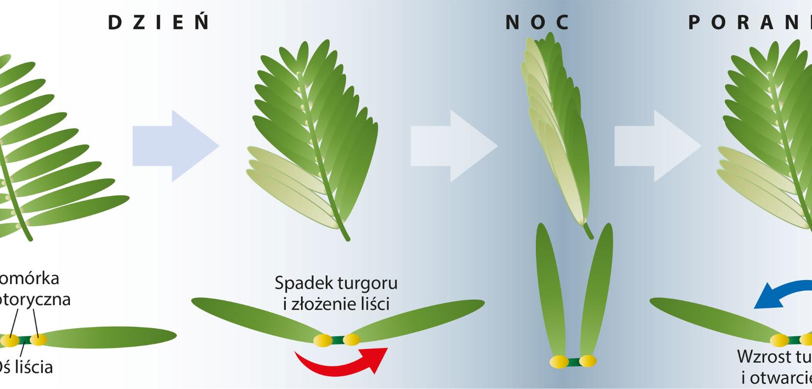 Podobnie do drzew zachowują się także ich mniejsi kuzyni – liście fasoli i mimozy codziennie „kładą się do snu”, opuszczając wieczorem. Rankiem liście „budzą” się i podnoszą do stanu pierwotnego. Jedna z hipotez wyjaśniających to tajemnicze zjawisko głosi, że rośliny wykonują odruchy senne, aby uniknąć ekspozycji na jasne światło księżyca, co mogłoby zaburzyć ich dobowy rytm. Podobnie robimy i my, zasłaniając okna przed utrudniającym zaśnięcie światłem miejskich lamp. Budzikiem roślin są pierwsze promienie słońca, które umożliwiają syntezę energii niezbędnej do życia. Liście się rozwijają, aby zwiększyć powierzchnię chłonącą życiodajne światło. Rachunek jest prosty: więcej promieni słonecznych, więcej energii do wzrostu i wytworzenia nasion.