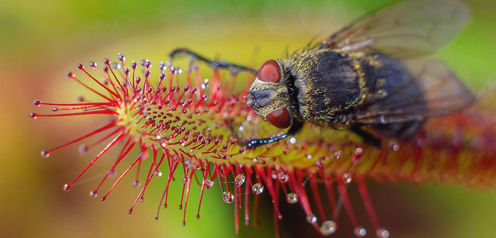 Przedstawiciele roślin mięsożernych polują nie tylko na owady, ale też na pajęczaki czy nawet niewielkie skorupiaki! Dzięki obecności przystosowań takich jak liście pułapkowe stały się bardzo skutecznymi drapieżnikami. W Polsce przedstawicielem tej grupy jest rosiczka, niewielka roślina występująca na podmokłych, bagnistych terenach. Wytworzyła ona liście pułapkowe zaopatrzone we włoski gruczołowe, które wydzielają lepką ciecz. To właśnie do niej przykleja się ofiara. Po jakichś trzech godzinach wydzielany przez roślinę kwas mrówkowy zaczyna rozpuszczać ciało owada. Ostatnie badania rzucają nowe światło na pochodzenie roślin owadożernych. Okazuje się, że zdolności do wydzielania enzymów trawiennych u australijskiego cefalotusa i rosiczki mają podobne pochodzenie genetyczne. Rośliny te zmodyfikowały geny występujące u ich zwyczajnych, przeprowadzających fotosyntezę krewnych. Na drodze ewolucji zaadaptowały je do procesu polowania na ofiary. Między innymi wykształciły gen odpowiedzialny za syntezę enzymu o nazwie chitynaza, rozkładającego owadzi szkielet zbudowany właśnie z chityny.