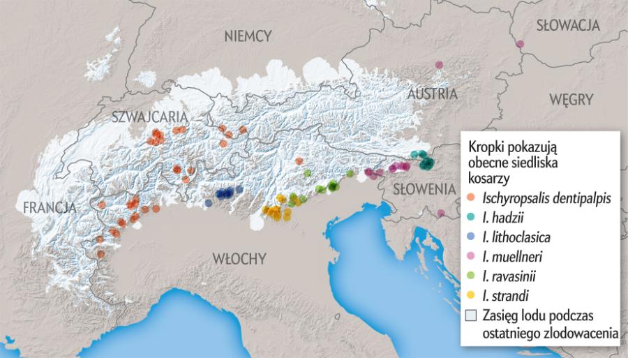 Kosarze to bliscy krewni pająków, z którymi są często mylone – jedne i drugie należą do gromady pajęczaków. Niektóre gatunki upodobały sobie zimne, wilgotne jaskinie w Pirenejach, Alpach i górach Półwyspu Bałkańskiego. Ich obecne terytoria układają się w wąski pas biegnący przez Europę. Mammola i jego współpracownicy porównali przebieg tego pasa do zrekonstruowanej przez geologów granicy południowego zasięgu lodu podczas ostatniego zlodowacenia. Stwierdzili, że jedno i drugie pasuje do siebie niemal idealnie.