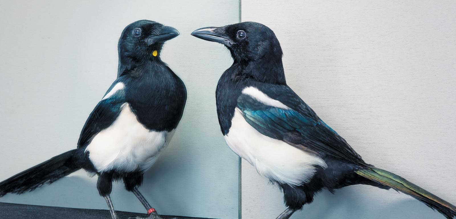 W moim laboratorium na Ruhr-Universität w Bochum przeprowadziłem wraz z kolegami doświadczenie ze sroką Gertie, któremu (Gertie to samiec) – po wyjęciu z woliery – zakryliśmy głowę materiałem i nakleiliśmy, niewidoczną dla niego, żółtą papierową nalepkę na czarnych piórach piersi. Następnie umieściliśmy go w klatce z dużym lustrem, pozostawiliśmy samego i przeszliśmy do pomieszczenia obok, gdzie mogliśmy na monitorze obserwować jego zachowanie. Gertie spojrzał w lustro i od razu zaczął gwałtownie pozbywać się naklejki, próbując chwycić ją dziobem i pocierając piersią o podłogę.
