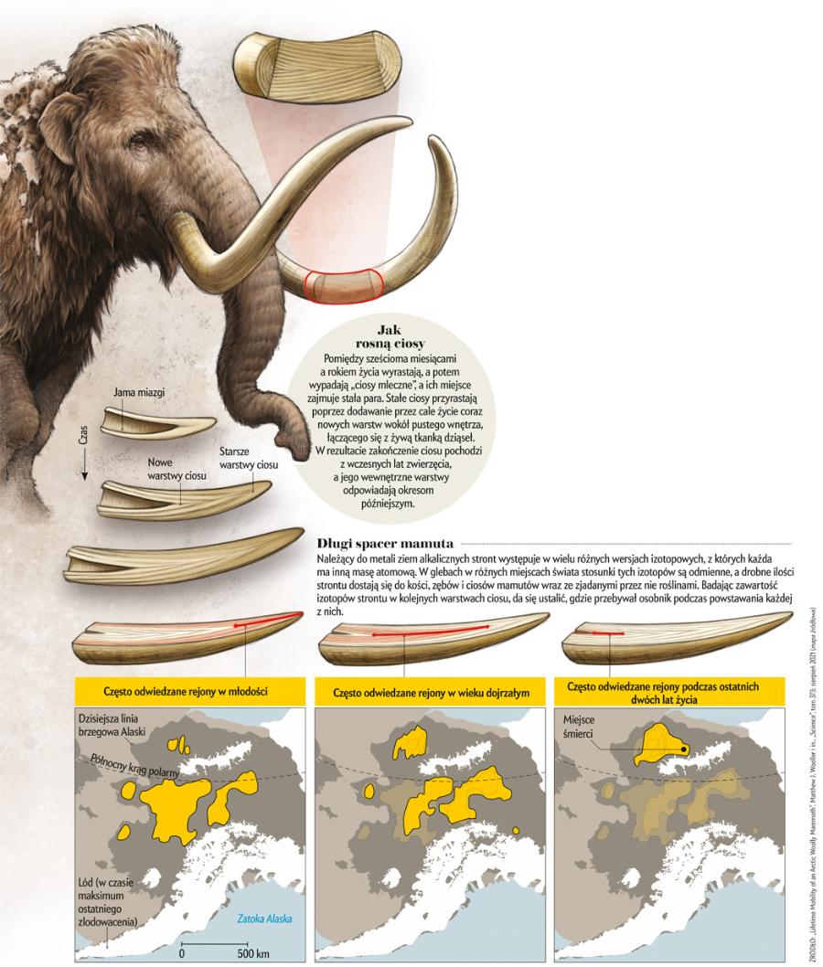 „Ciosy to swoiste biologiczne zegary” – mówi paleoekolog z University of Alaska w Fairbanks Matthew Wooller. Wraz ze współpracownikami przecięli na pół ponad półtorametrowej długości cios, a następnie przeanalizowali zawartość chemiczną każdej jego warstwy w celu odtworzenia marszruty zwierzęcia w ciągu całego jego życia. Z tych analiz wynika, że przez 28 lat osobnik ten przebył ponad 80 tys. km, wędrując po bezdrożach dzisiejszej Alaski. W przyszłości zespół planuje przeprowadzić podobne badania na większej liczbie mamucich ciosów. „A mamy ich setki” – dodaje Wooller.