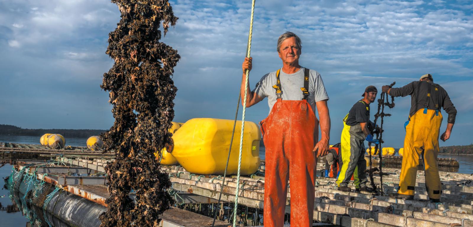 Carter Newell jest właścicielem czterech najbardziej wydajnych farm omułków w stanie Maine. Sam nimi na co dzień zarządza. W rześki wiosenny poranek wsiadałam wraz z nim i jego dwoma pracownikami na łódkę, którą dotarliśmy do kutra Mumbles zacumowanego w spokojnCym zakolu rzeki Damariscotta. Kuter, którego nazwa pochodzi od walijskiego miasteczka, gdzie Newell kiedyś prowadził badania, był przywiązany do drewnianej tratwy, z której zwisały setki sznurów długości kilkunastu metrów z przyczepionymi do nich małżami w różnych stadiach rozwoju.