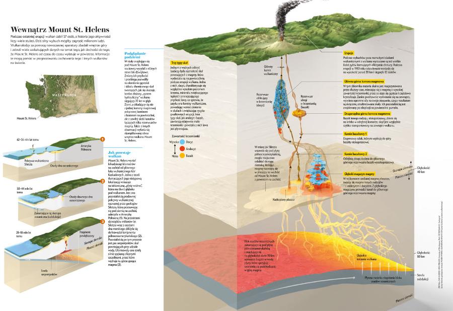 Ta oraz 69 innych terenowych stacji sejsmicznych rozmieszczonych wokół Mount St. Helens rejestrują od trzech lat najmniejsze pomruki skorupy ziemskiej – od trzęsień ziemi przez eksplozje ładunków wybuchowych po szum fal oceanicznych uderzających o odległy brzeg morski. Aparaturę zainstalowano w ramach projektu Imaging Magma Under St. Helens, w skrócie iMUSH, którego celem jest monitorowanie wędrówki magmy przemieszczającej się z wnętrza skorupy ziemskiej ku powierzchni. To jedno z najbardziej ambitnych i kompleksowych działań podjętych w celu szczegółowego poznania „systemu hydraulicznego” wulkanu – układu podziemnych komór i kanałów, w których gromadzi się i którymi wędruje gorąca magma. Tradycyjne wyobrażenia na temat budowy wulkanów są dość proste: na dole mamy komorę z magmą, od której odchodzi w górę komin wulkaniczny z wylotem w kraterze. Jednak pod Mount St. Helens płynna materia skalna wędruje poprzez kilka połączonych ze sobą rezerwuarów, przechodząc po drodze rozmaite przemiany chemiczne mogące zwiększyć impet erupcji. Magma zasilająca wulkan przemieszcza się zarówno horyzontalnie, jak i wertykalnie, omijając przeszkody i wykorzystując istniejące już uskoki i głębokie szczeliny skalne. Jej ruchowi towarzyszą płytsze i głębsze trzęsienia ziemi, które mogą zapowiadać przyszłe eksplozje, gdy już komora wulkaniczna ponownie wypełni się magmą.