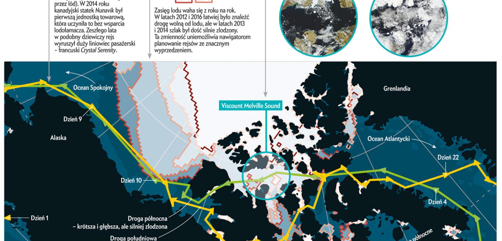 W miarę jak kurczy się letnia pokrywa lodowa na Oceanie Arktycznym, legendarne Przejście Północno-Zachodnie coraz bardziej kusi marynarzy. Droga morska, wiodąca przez szereg cieśnin przecinających północną Kanadę, skróciłaby o blisko 5000 km odległość pomiędzy Nowym Jorkiem a Szanghajem, w porównaniu ze szlakiem przez Kanał Panamski. W praktyce jednak wieloletni lód morski bywa tak nieprzewidywalny, że arktyczny rejs wciąż jest obarczony olbrzymim ryzykiem oraz wysokimi kosztami.